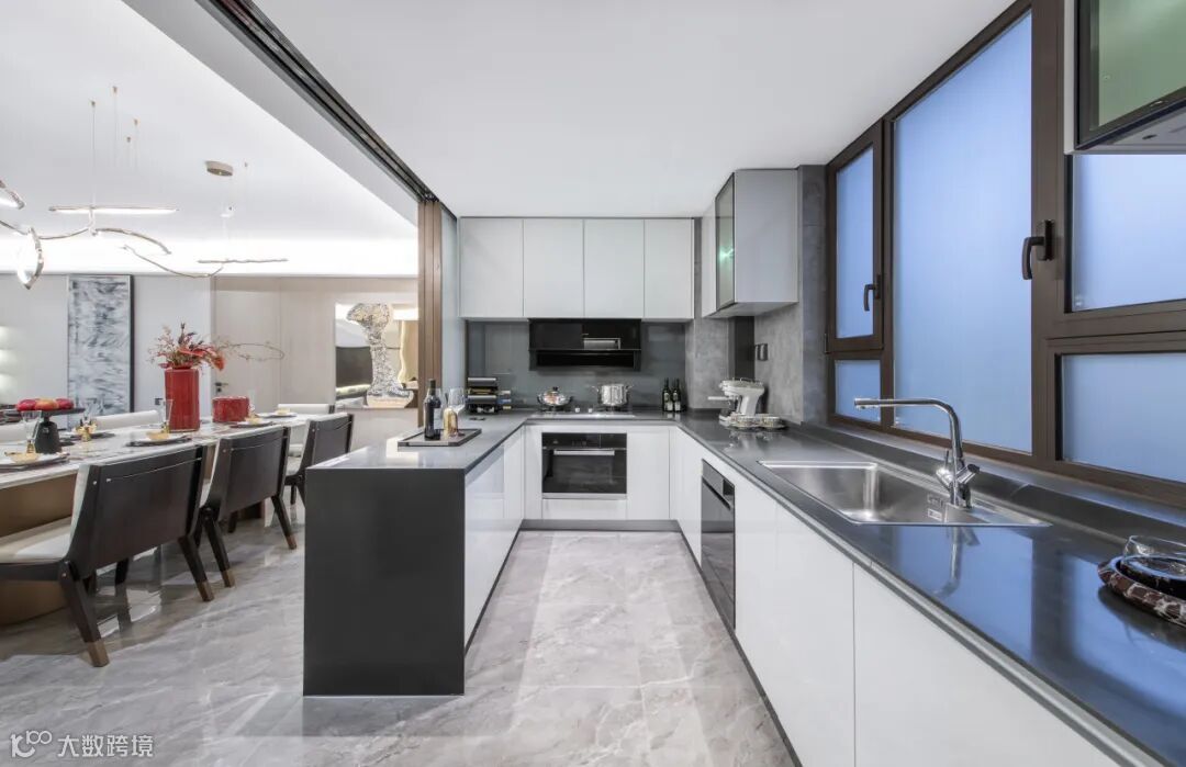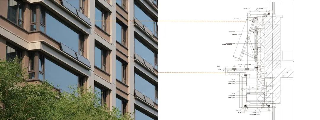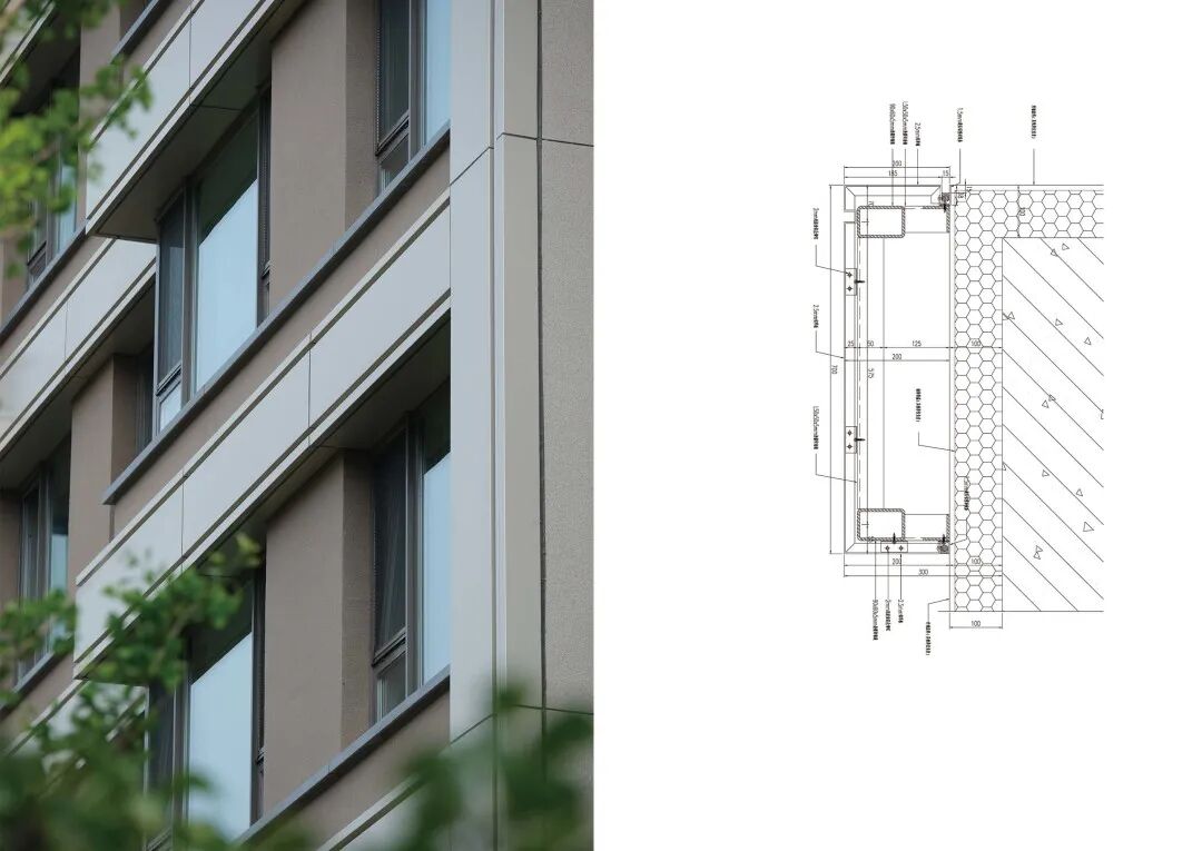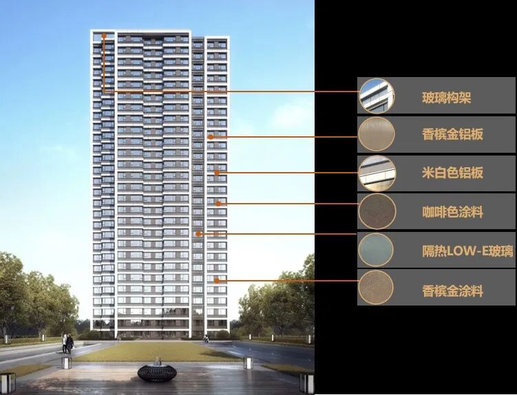 整体建筑风格以大面积的铝板幕墙为主,结合现代造型手法,注重材料与质感的呈现。立面上大量使用玻璃与铝线脚等现代建筑材料,突显出建筑的精致感。色彩方面,选用了深灰色与米白色铝板的配色,整体效果沉稳大气,造型简洁,用材通透,营造出舒适的居住氛围。
