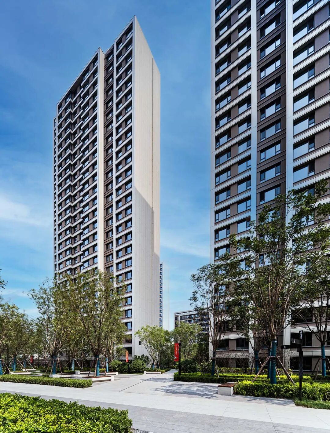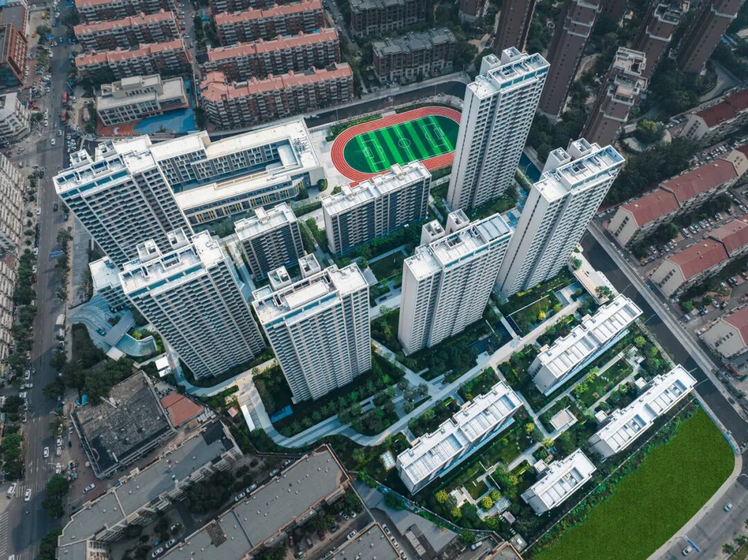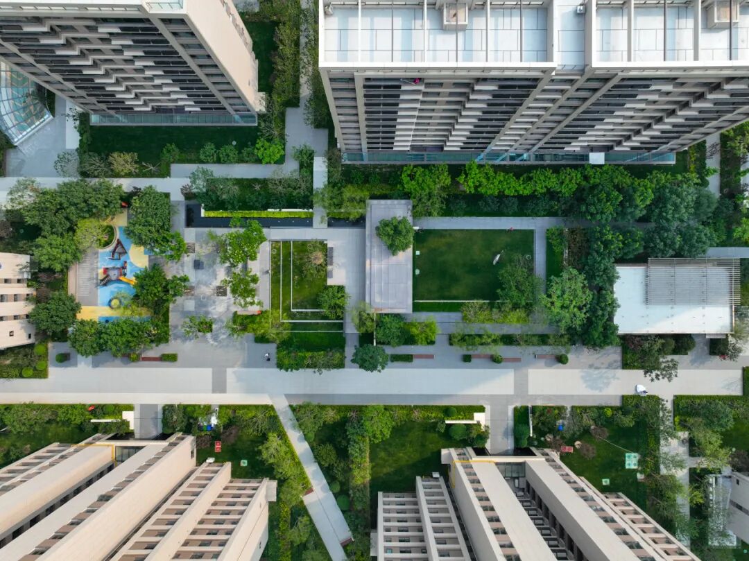 空间上因地制宜,前排布置多层建筑,延续了原有城市道路的尺度感受,呼应城市结构;后排则设置高层建筑且视线朝向南侧公园,让住户尽览子牙河的自然风光与城市绿意。
