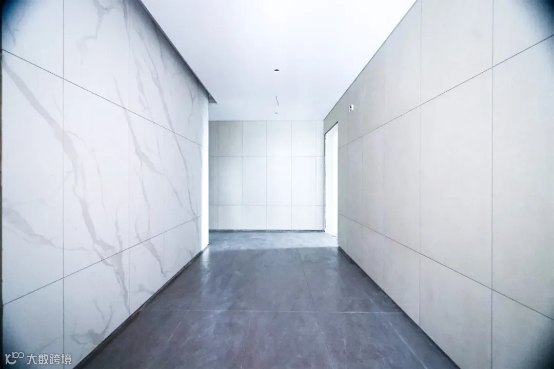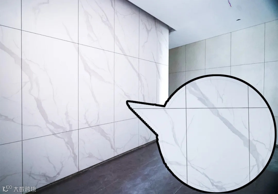 其实公区装修,最难的部分就是连纹砖对纹。大家仔细看左边的墙面,全都是带纹路的,工人铺贴每一块瓷砖的时候,那都是严格按照编号施工的。