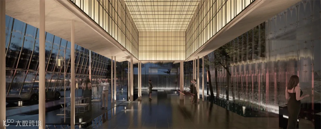 玉门内部,内藏精致木构,通过艺术形体重构一个木构建筑,营造出一个内有乾坤的空间体验。大堂包括长桌等候区、大堂服务区,灯光从木构缝隙中渗透出来,中心区域设置通高灯箱,加强大堂的仪式体验。