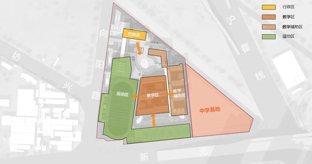 With a site area of about 15,000 square meters, the project is required to provide 30 classes with an above-ground floor area of 17,000 square meters. Undoubtedly, this inevitably leads to a high floor area ratio and high density. At the same time, the triangular shape of the site brings greater difficulties and challenges for the architectural layout. Besides, this project was intended to be an expansion of the existing Chunyang Primary School as the junior high school at the beginning. However, after completion, the project was converted to independent operation and use. So the design as a whole follows the logic of expansion and remodeling.