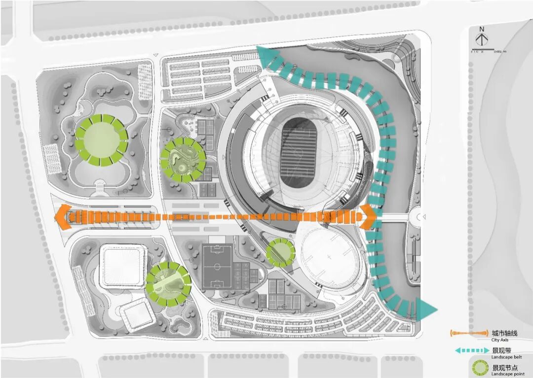 诗意的设计:具有地域特色的体育中心该项目位于襄阳市城市绿化轴和景观轴的交汇处。周边景观优美。汉江自西向东穿城而过,与连绵起伏的群山共同构成了山环水绕的地理格局。设计从山水相依的城市景观格局出发,采用 “襄水(襄阳的河流)飘如云,绸带舞动,尽显风采 ”的设计理念,顺应地形地貌,在合理设计中展现浪漫诗意。
