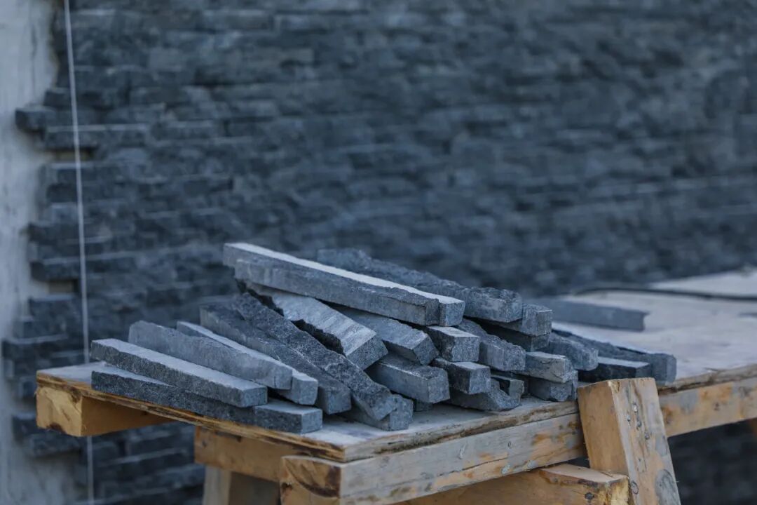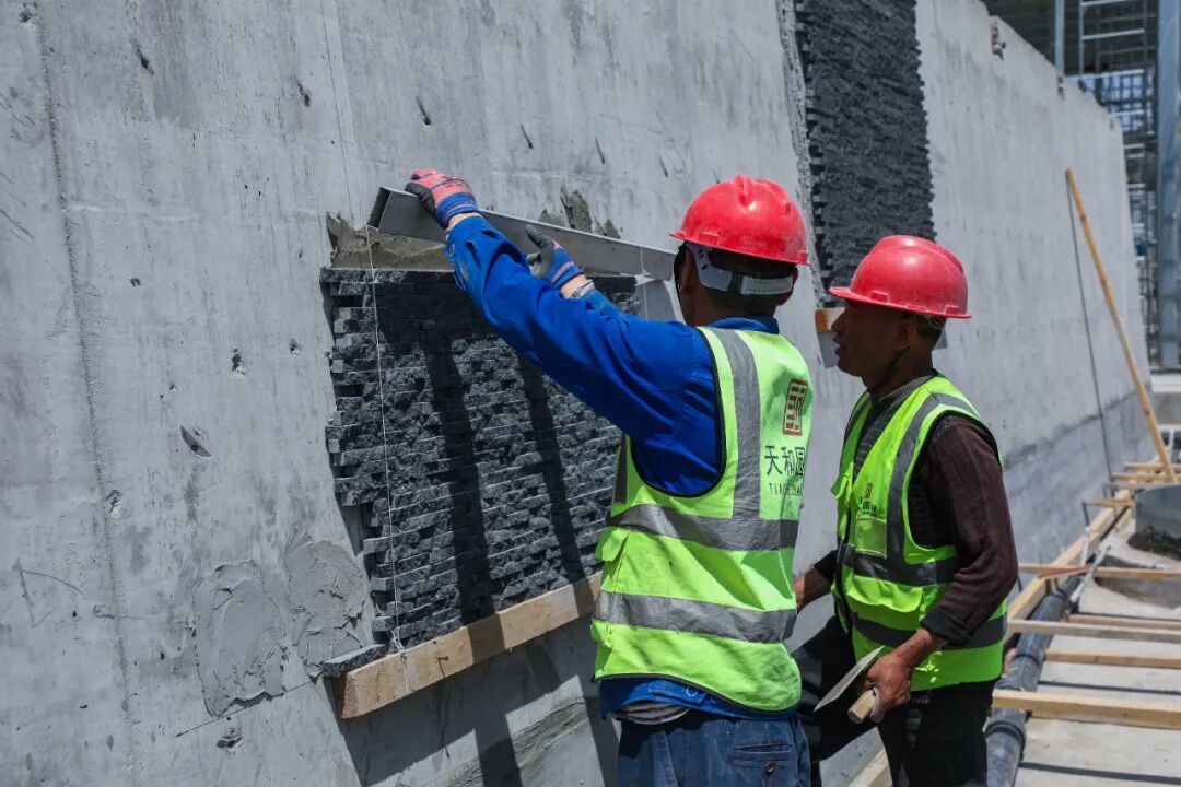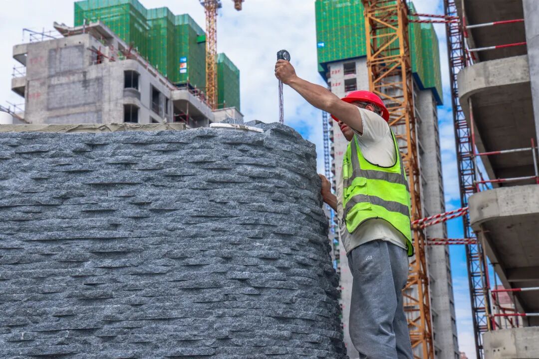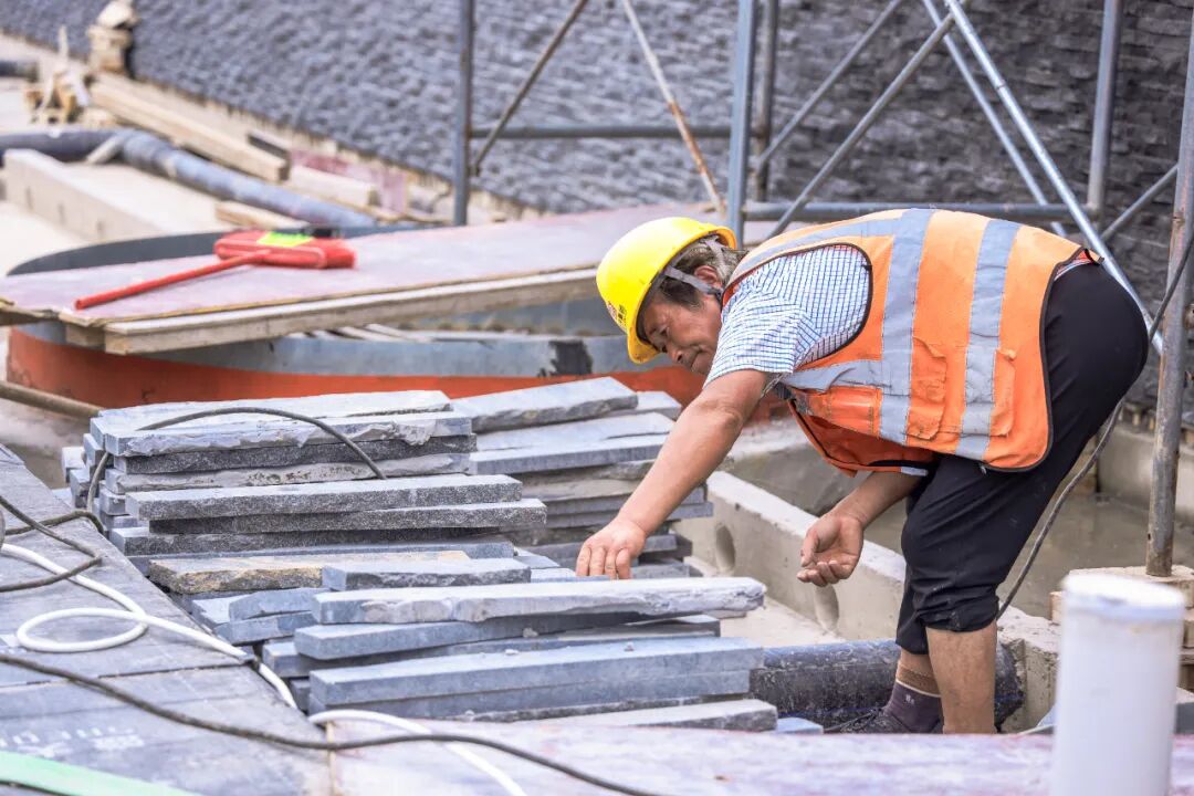 金明書院大门的水幕墙,看似没有规律,但也不能杂乱无章,要做出高低起伏的凹凸感。所以在选择石材的时候,要进行精心搭配。这对工人的施工工艺与审美都有严格要求,只能从外地专门找老师傅来施工。即便如此,一个经验老道的老师傅,一天施工的平均量还不到0.5平方米。