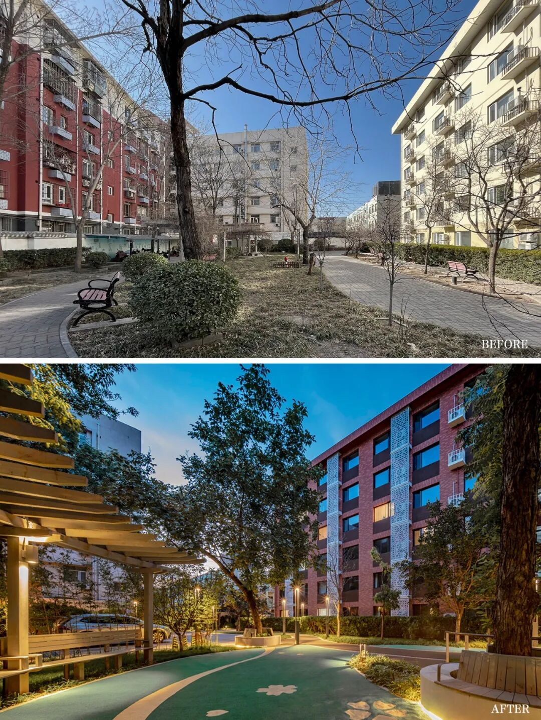 改造工作对于场地和建筑采取不同的策略。院子内的公共空间与胡同尺度接近,重在延续胡同味道的灰墙青瓦风格。往日,长者们经常围坐在门口广场活动,改造后,主入口广场设置水景墙,青砖、灰瓦、流水与休闲座椅融为一体,长者们可以继续在这里闲谈小聚。结合长者喜欢晒太阳随坐随聊的习惯,院子里散步道旁设置各类座椅,周边缤纷花丛中点缀着小水缸、自行车等微景观。