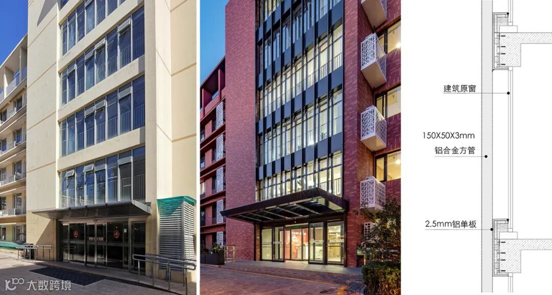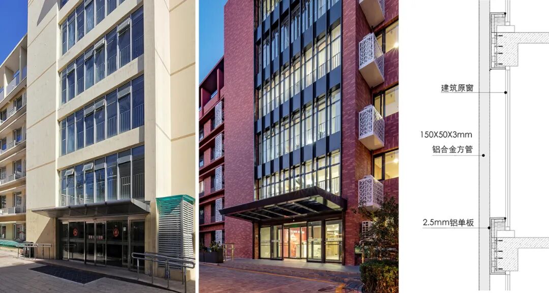 在实地探勘时,我们发现由于原建筑的施工误差,有些开启扇在水平位置上有不同程度的偏移,如果铝方管紧贴原有窗框,会导致一些窗户无法开启。因此,我们将铝方管与原窗脱开,固定在窗间墙外皮。虽然在“幕墙”的整体性方面会有瑕瑜,但保证了开窗的功能,同时通过玻璃的反射效果,最终也呈现出良好的光影效果。
