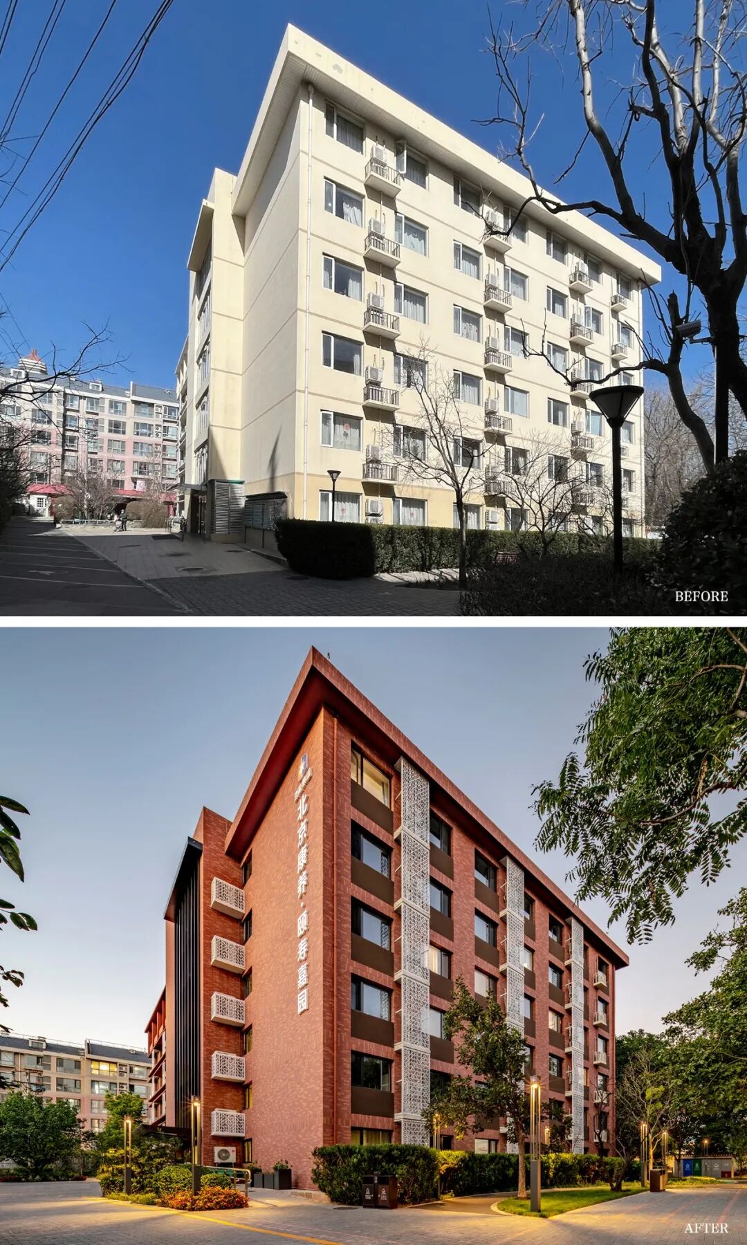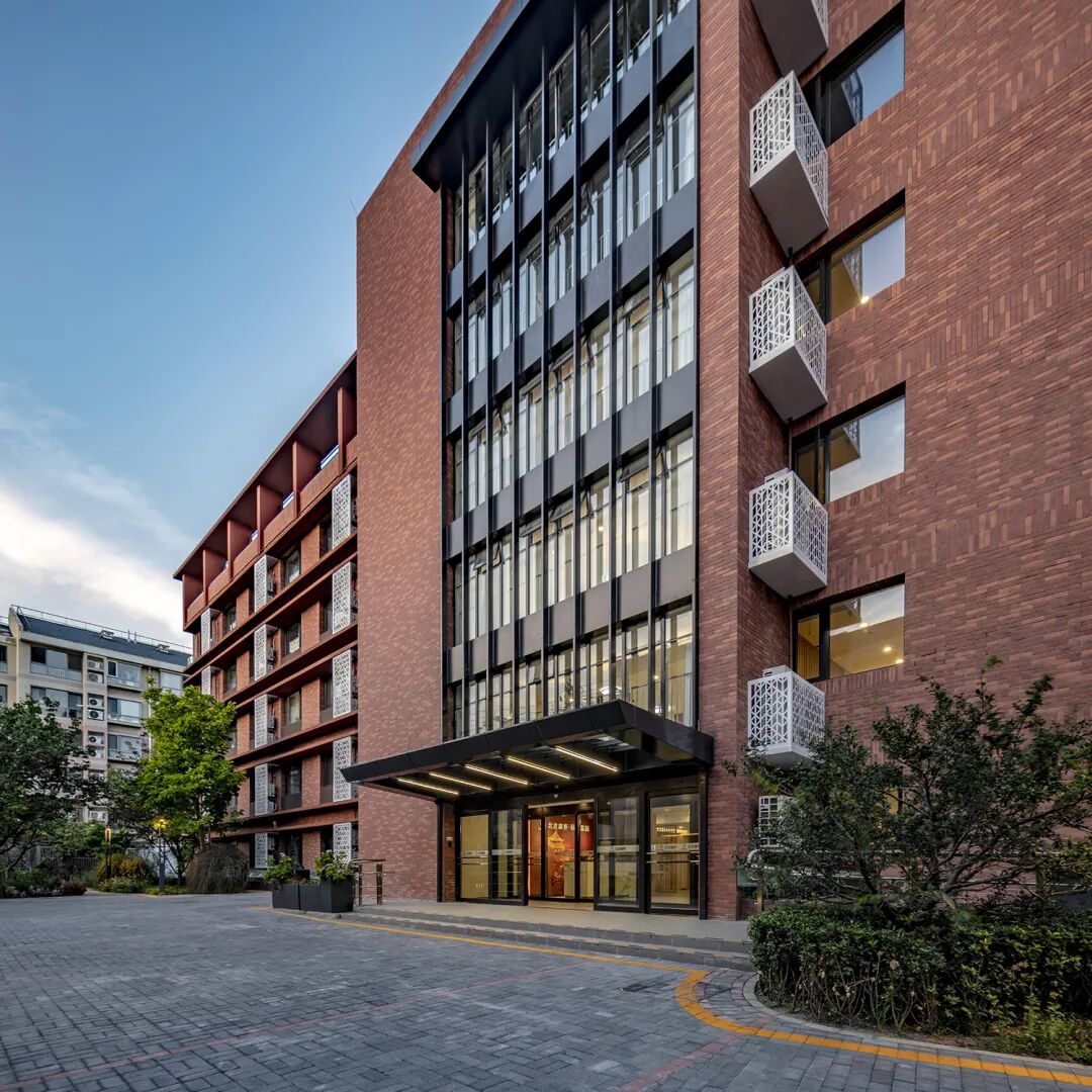 院子里的主体建筑体量高大,并不适合采用清冷的灰色,在北方的气候影响下,温暖的色彩更适合长者们的生活。同时,根据业主需求,期望我们通过统一且具有标志性的设计语言,打造出鲜明的品牌形象。故而,本案呈现出与顺义东竹园项目一脉相承的要素,“红墙白栅”构成属于北京康养的建筑造型。
