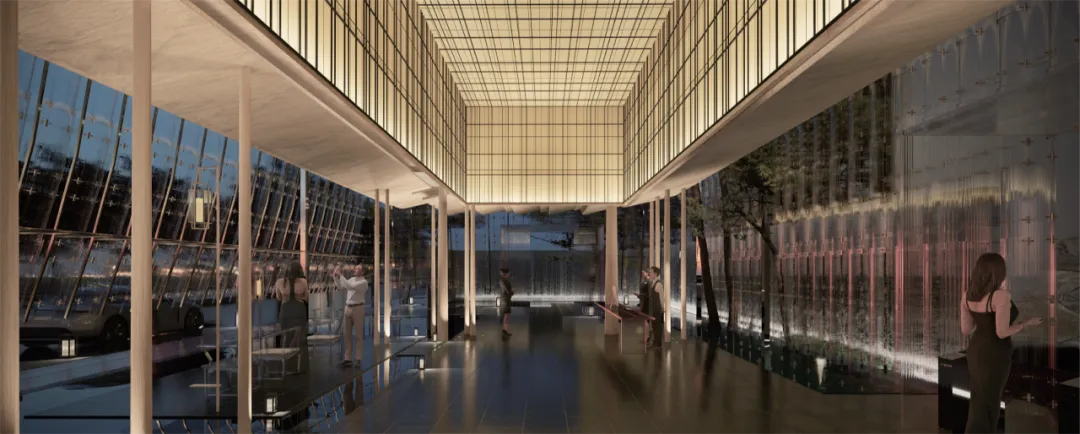 玉门内部,内藏精致木构,通过艺术形体重构一个木构建筑,营造出一个内有乾坤的空间体验。大堂包括长桌等候区、大堂服务区,灯光从木构缝隙中渗透出来,中心区域设置通高灯箱,加强大堂的仪式体验。