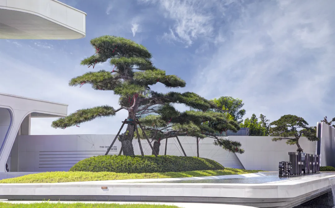 大门两侧的消防门蕴含中国人的含蓄之美,先见景后见门,入口与景观融为一体。门前的古松、山石、草坪犹如一块屏风,若隐若现。