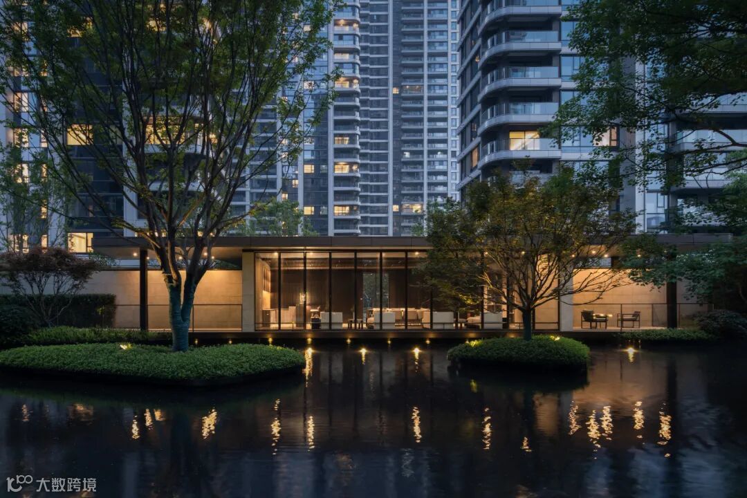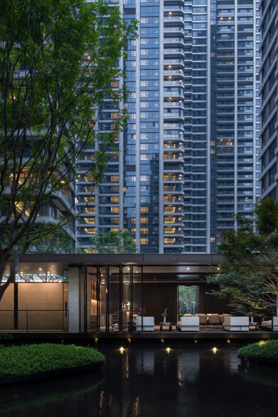 入口中庭设计580㎡大尺度亲水空间,夹道过后,豁然开朗。大水面宽敞的视觉效果,打破消防的规则边界感,也解决了狭长局促的空间感受。百余平摩登会客厅形成水面的聚焦点,自然江岸绿意结合酒店式摩登会客厅,延续曼哈顿滨江豪宅精英轻奢的生活方式。