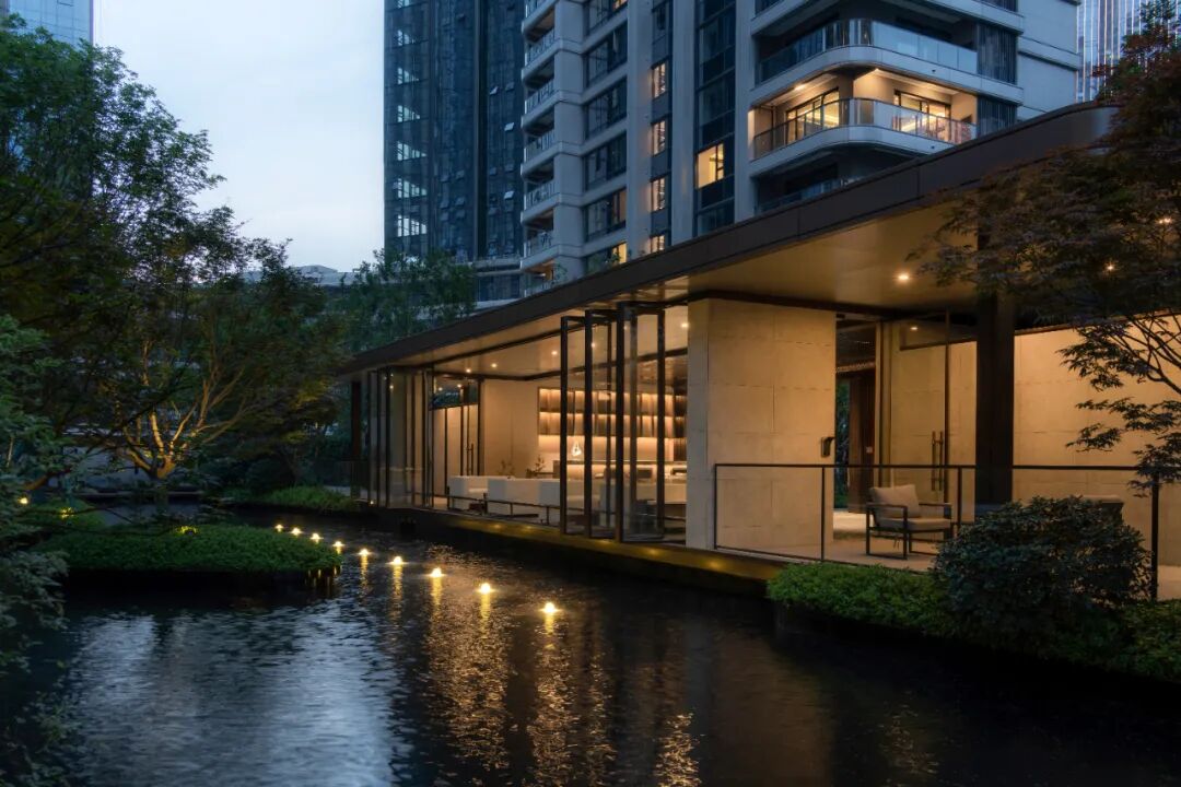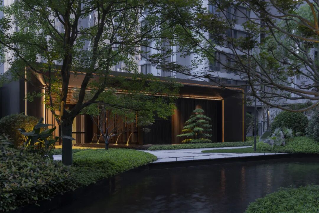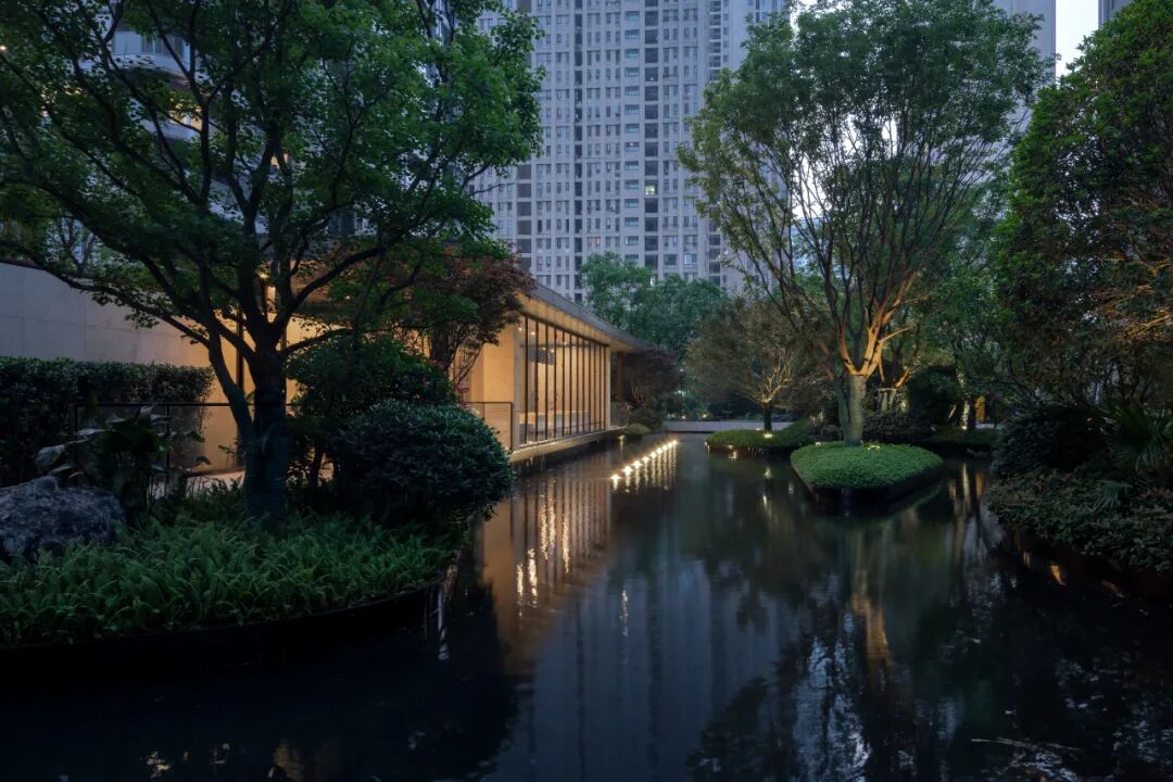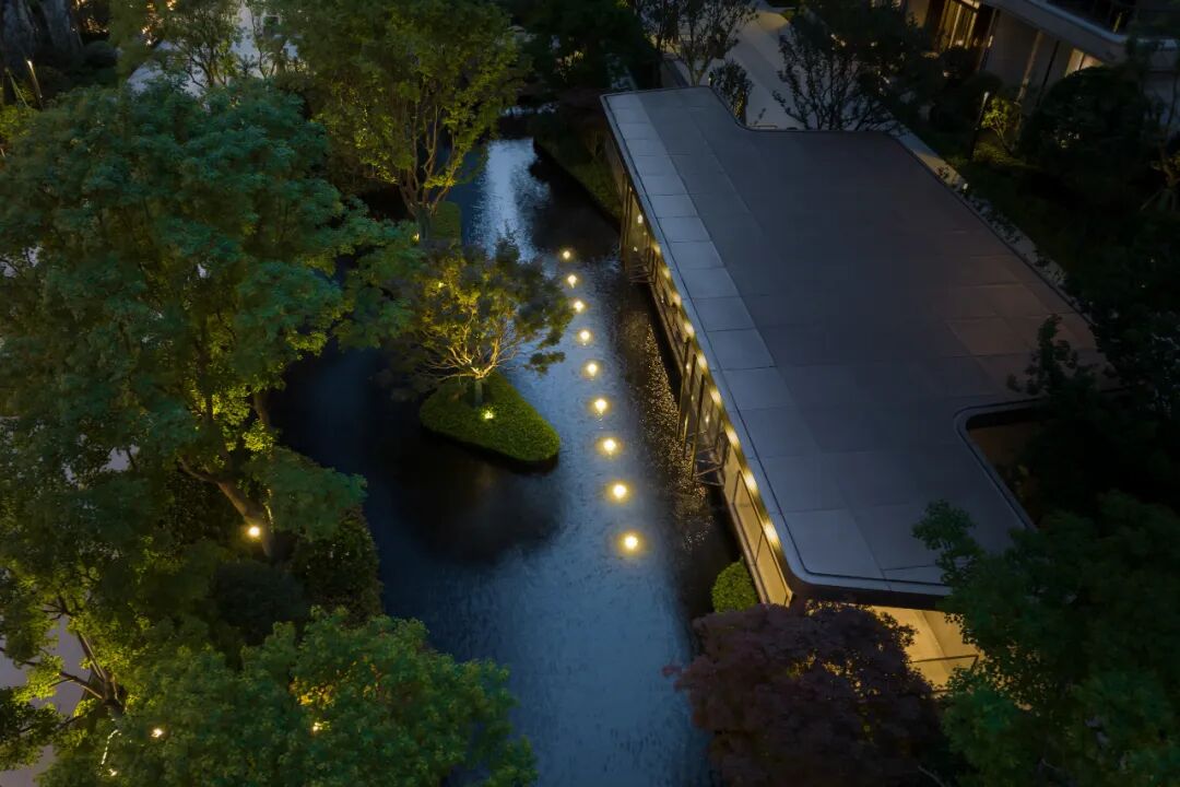 夜幕低垂,工作尘嚣渐远,沿江归途。37米超宽昭示主入口界面,金属质感突出尊贵气息。20米礼序水景归家廊道,天花与侧墙采用弧形金属板一体化打造,引水入园,以路为桥,过桥而归,给予了业主尊崇与端庄的体验。