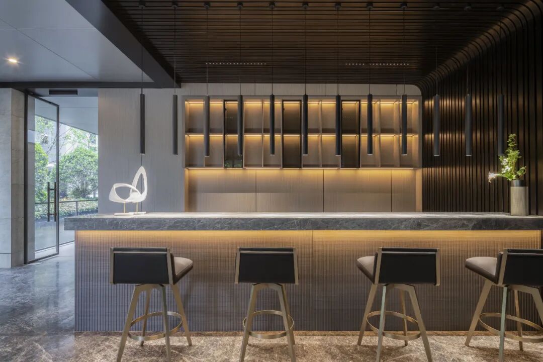 内部空间匹配会客私宴、艺术展览、私享放映等多种社区活动,传递精英人群的生活态度和生活方式。精致的内部细节,融合温馨灯光氛围,营造酒店式度假氛围。