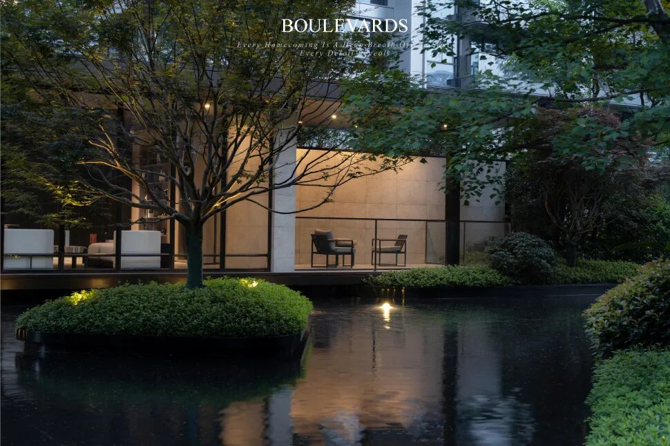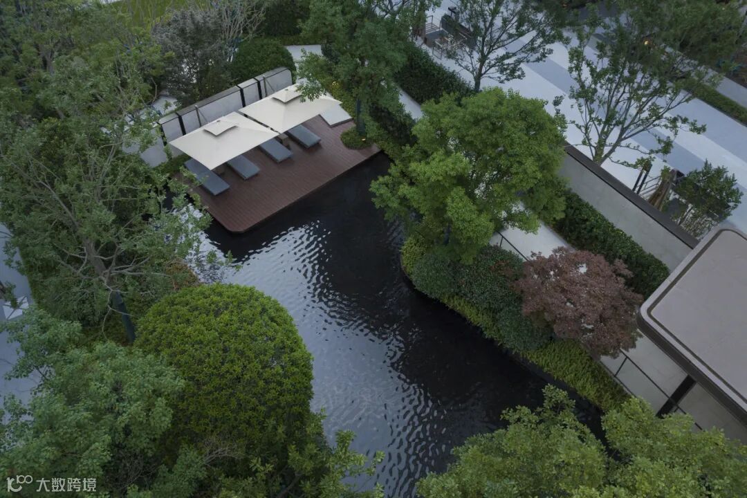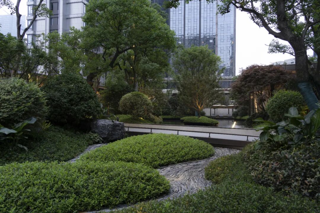 特选单株名贵造型松点缀水中树池,软景与硬景互为渗透,精奢休闲,尽在此间。