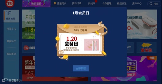 在TGO商城首页领取会员专属优惠券(不同会员等级将弹出相应面额的优惠券,仅限1月20日会员日当天领取及使用)