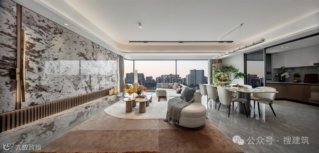 端户A户型:独立电梯入户、约56㎡的LDKB一体化超级社交厅、270°无转柱曲面屏设计,全景舱视野、约32米超大景观面,连次卧都做了270°全景采光……