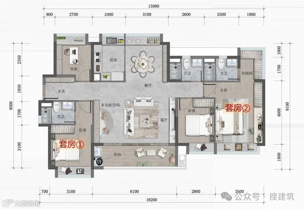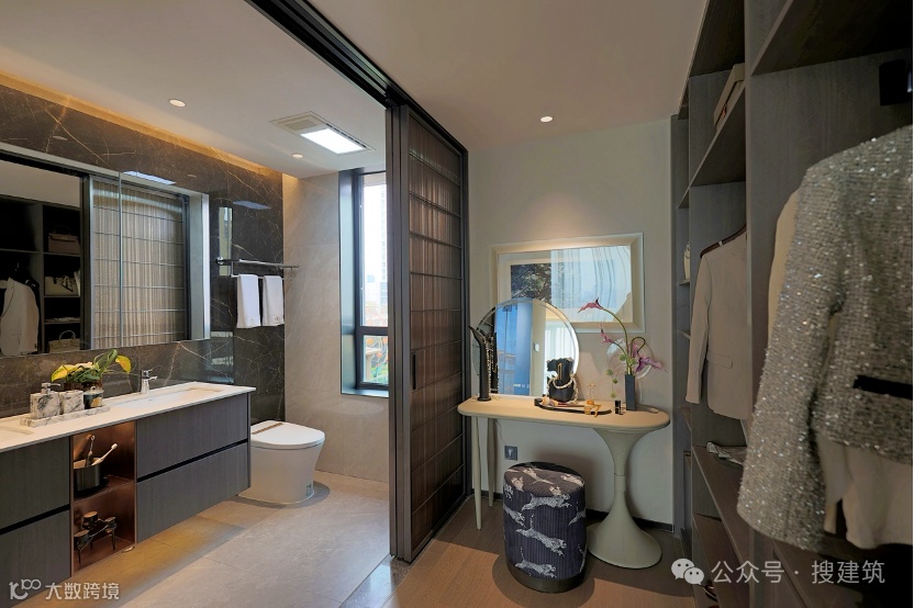 而且主卧空间若与相邻次卧打通,可以打造一个景观面约6.8米,带书房、独立衣帽间、卫浴空间和可变休闲功能空间的约41㎡超级豪华行政大套房。