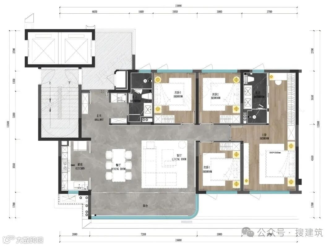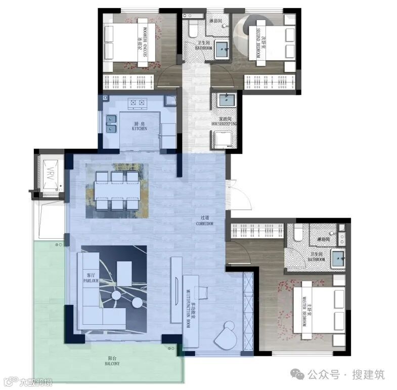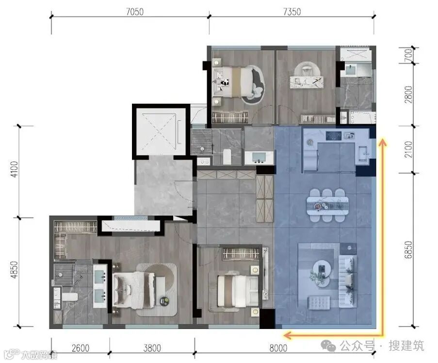 A户型的不同,主要在于卧室的布局,完全实现了动静分区,四间卧室集中于一侧,更适合二孩、三孩家庭。