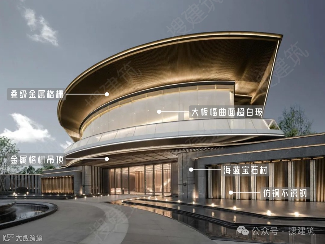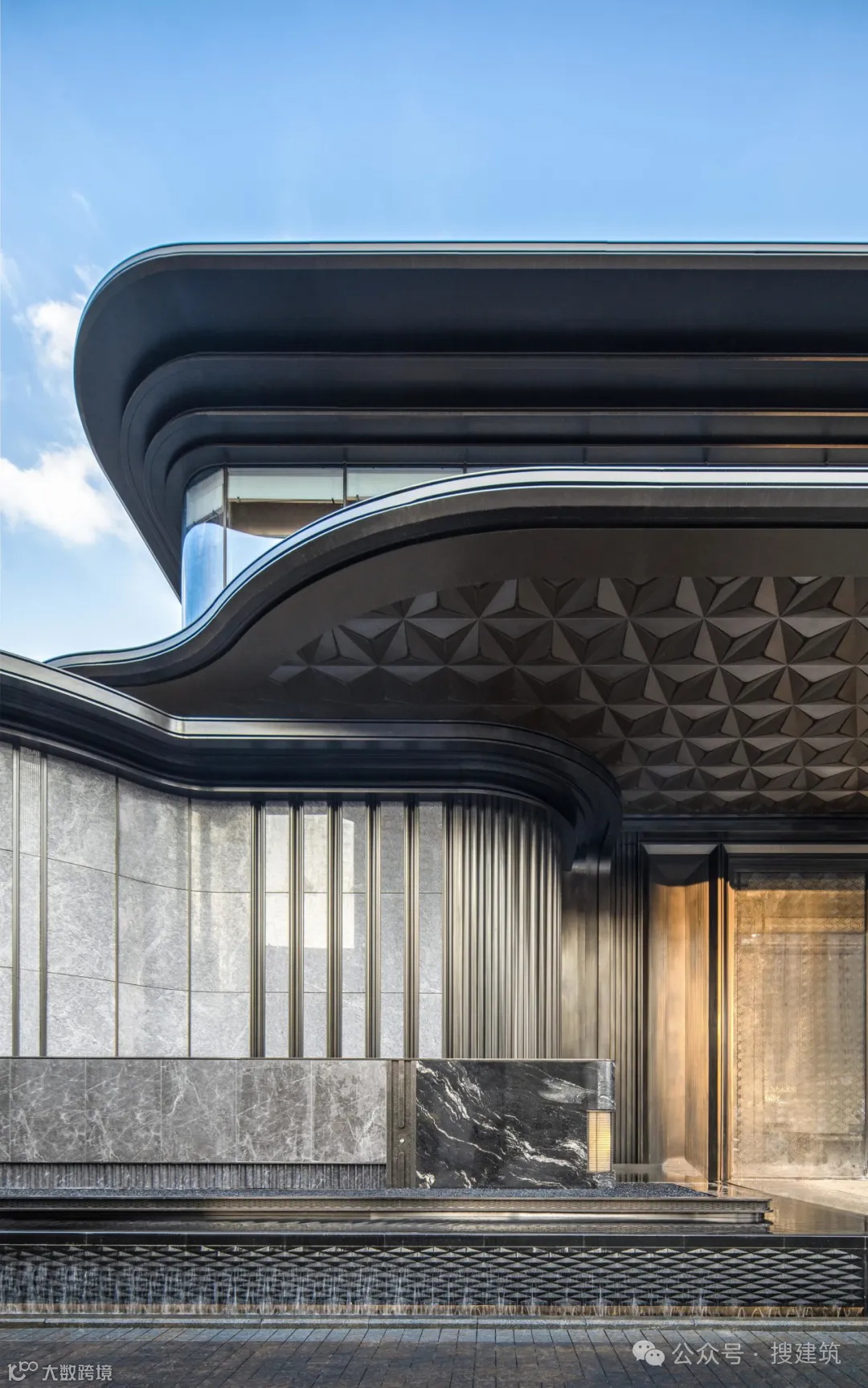 局部斧凿处理海蓝宝石材主景墙,搭配体量超大且未来感十足的超大板幅曲面玻璃幕墙,气场拉满。