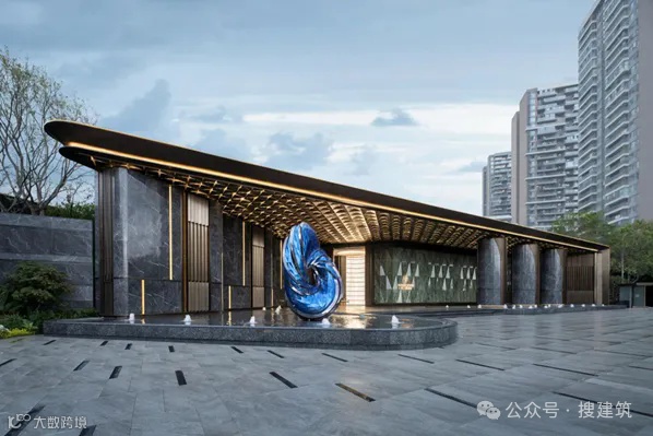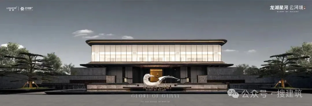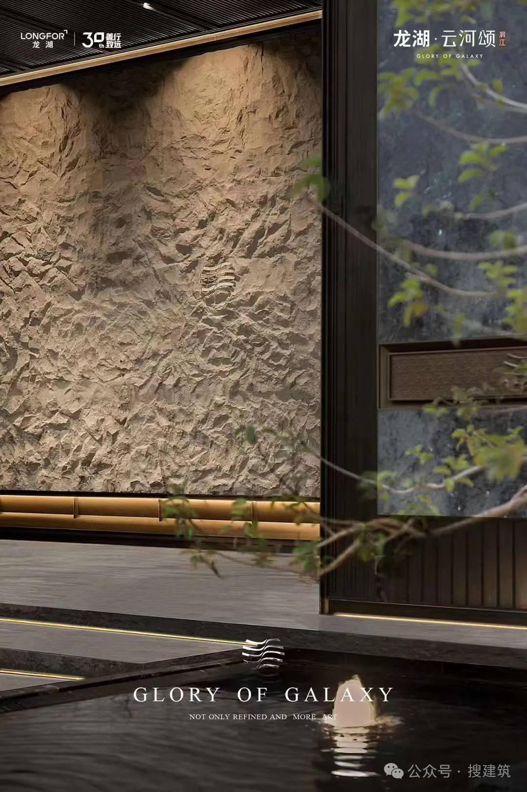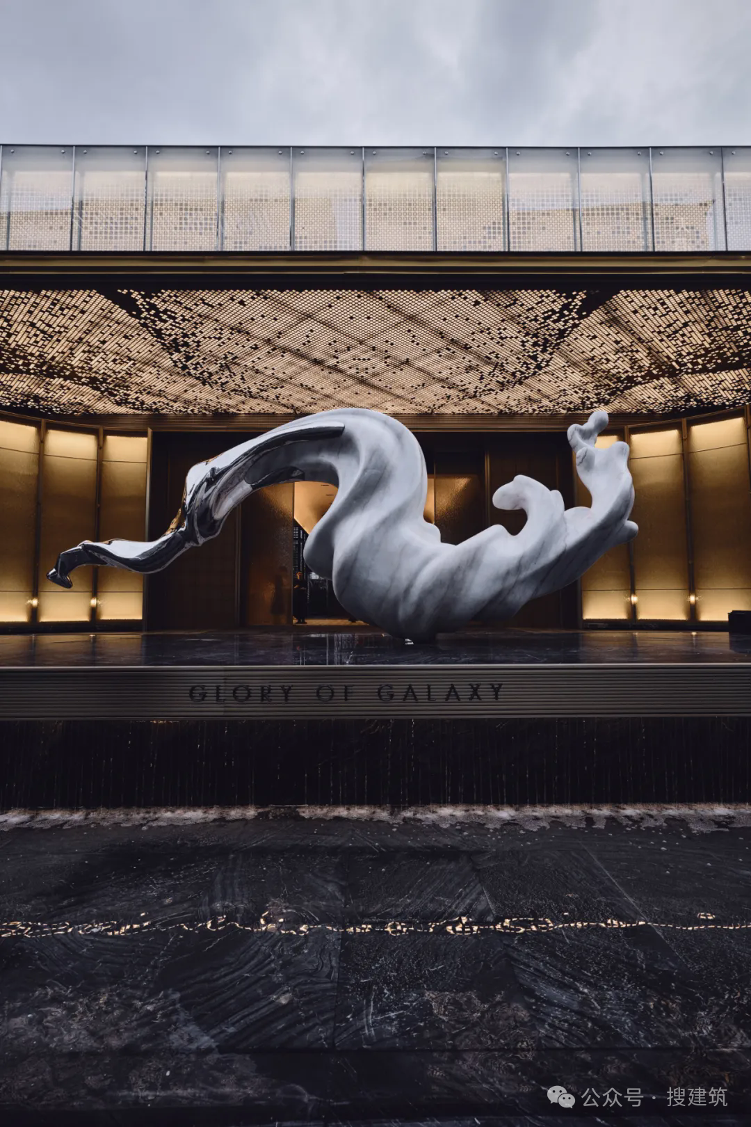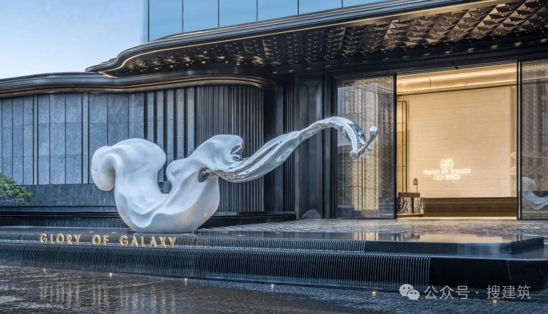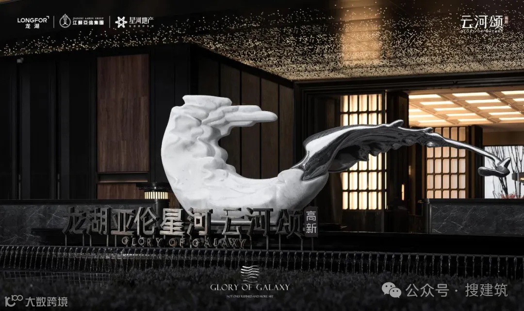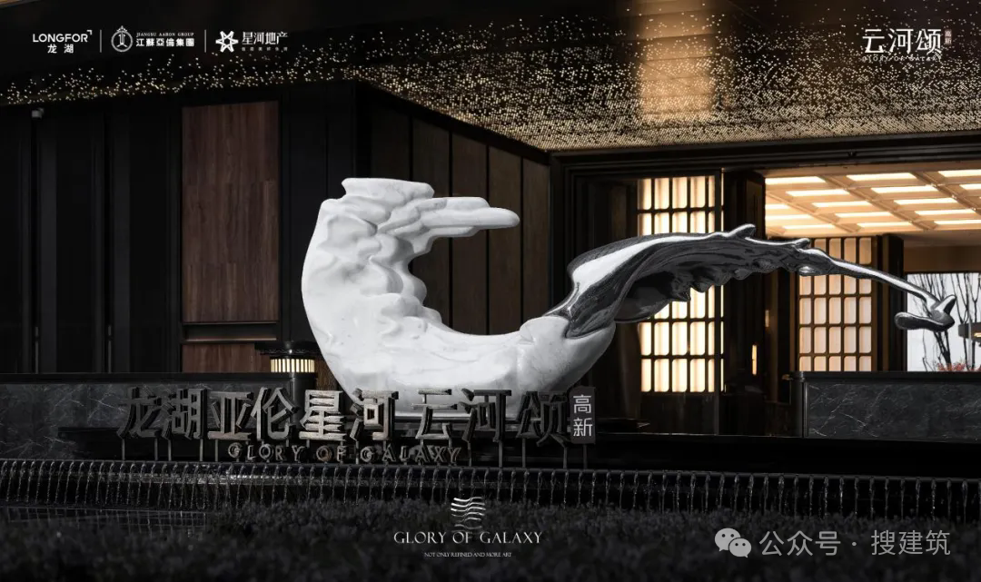 石家庄龙湖·青云阙从酒店式礼序入口,层层递进归家礼序,以100m的超长界面展示入口,尊享归家仪式感;入口5重层级跌水,强调礼序归家。以及定制的雕塑——云鹤之翼,精工细节,彰显了东方礼序的底蕴与尊贵感。