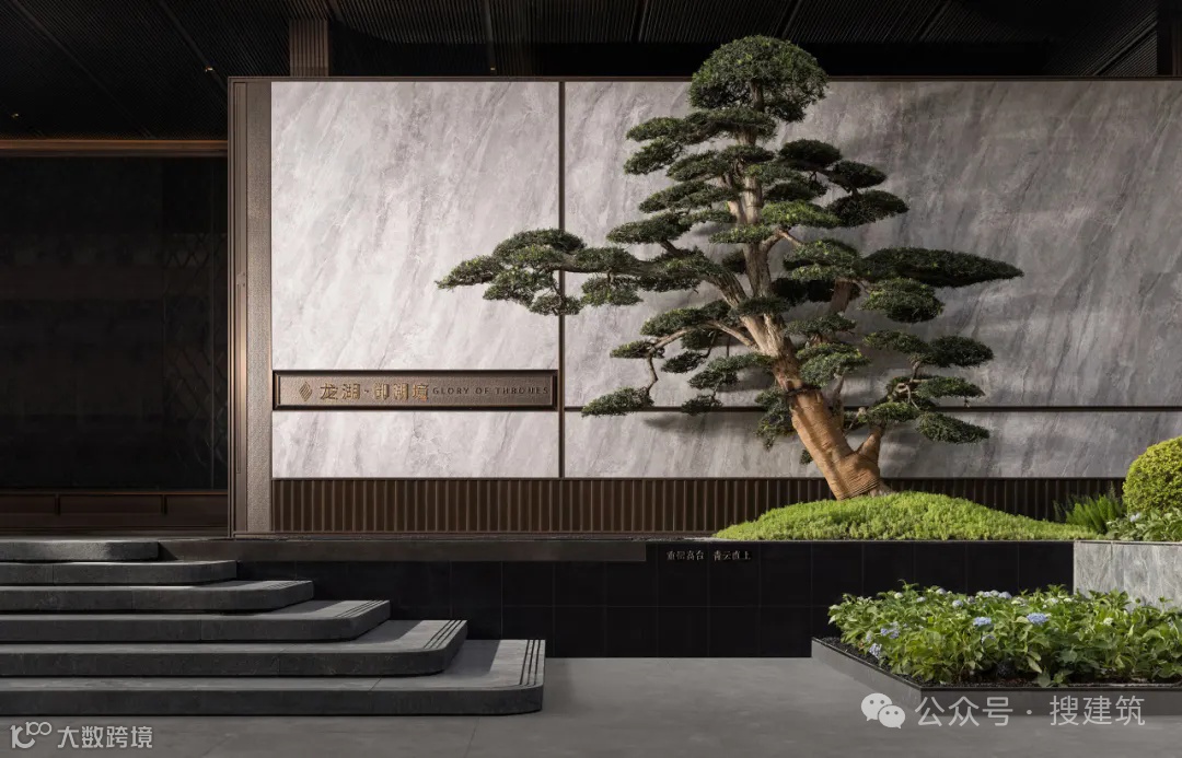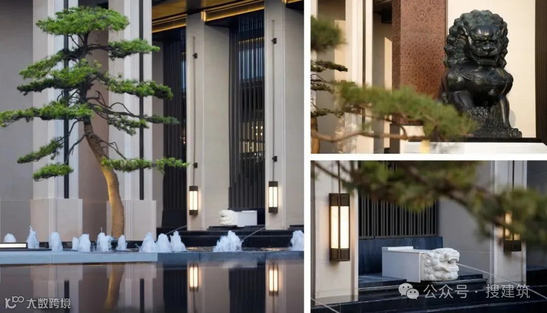 通过九层台阶和五重水幕的设计,以及泰山松作为对景,展现了现代东方美学的魅力。
