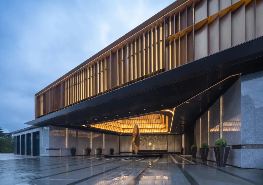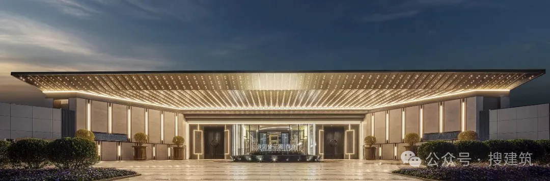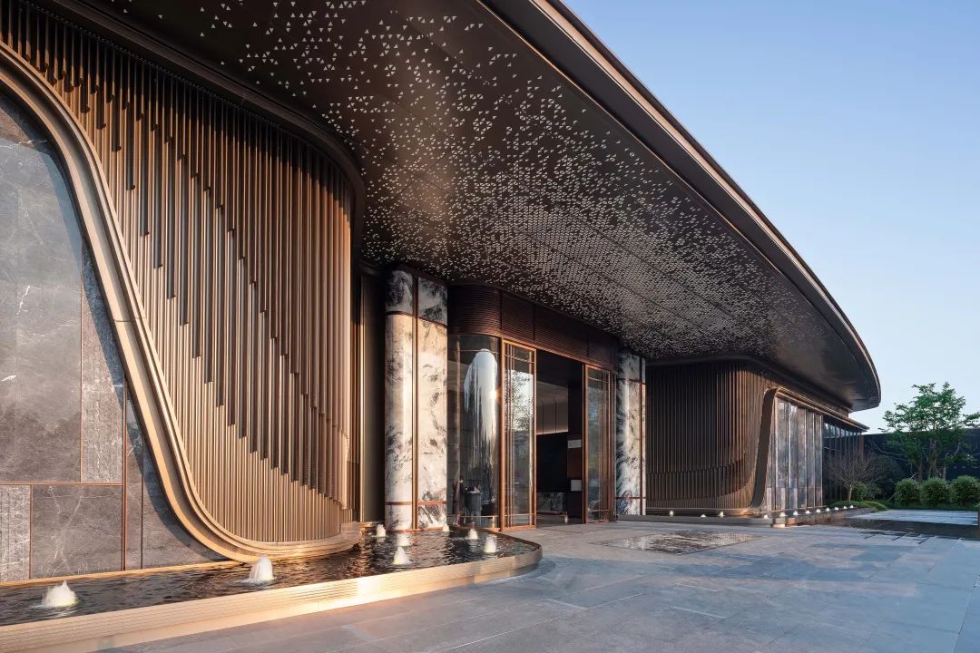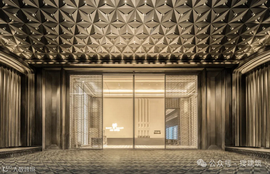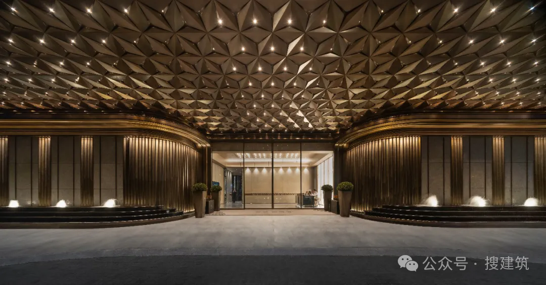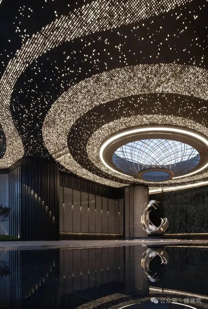 酒店落客区溯源材料本真,温暖的光线超大尺度的镂空穹顶,开启归家的尊享礼序。
