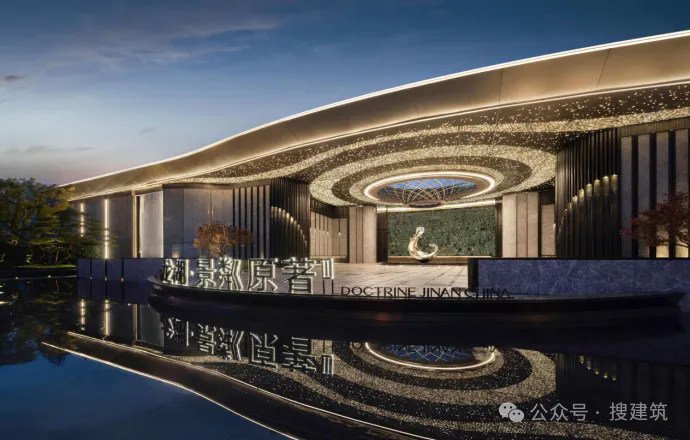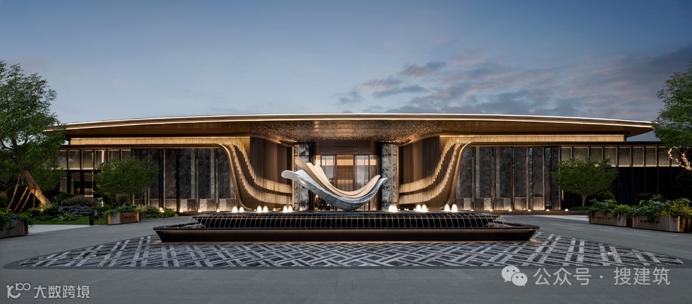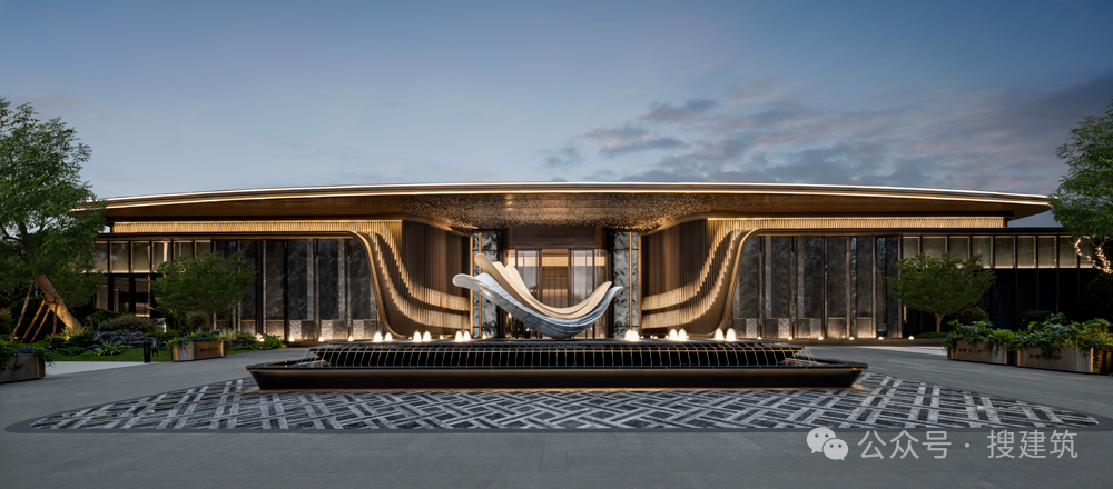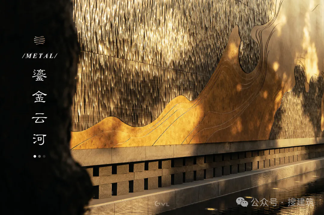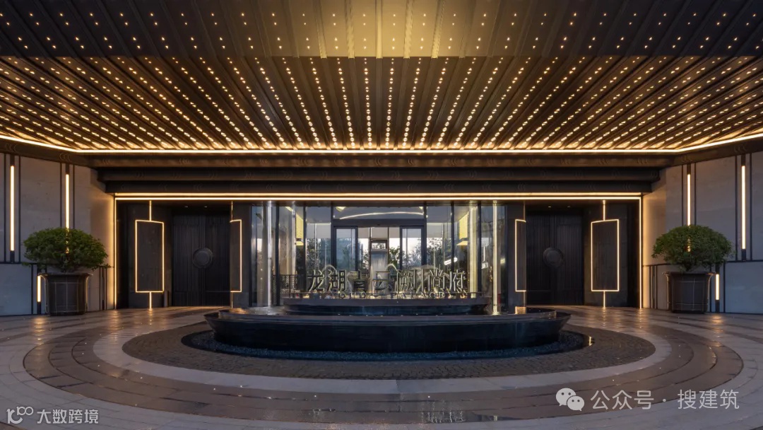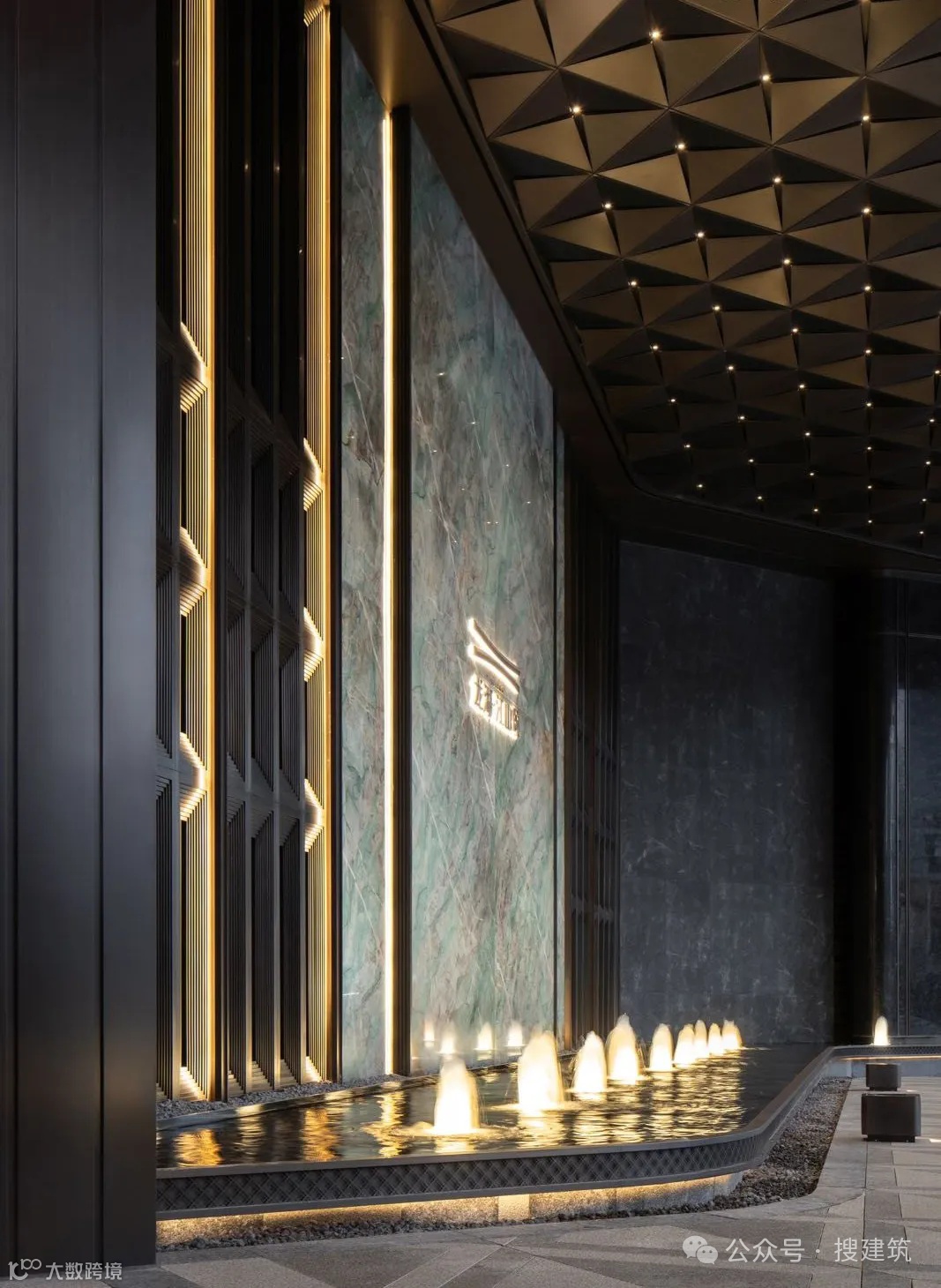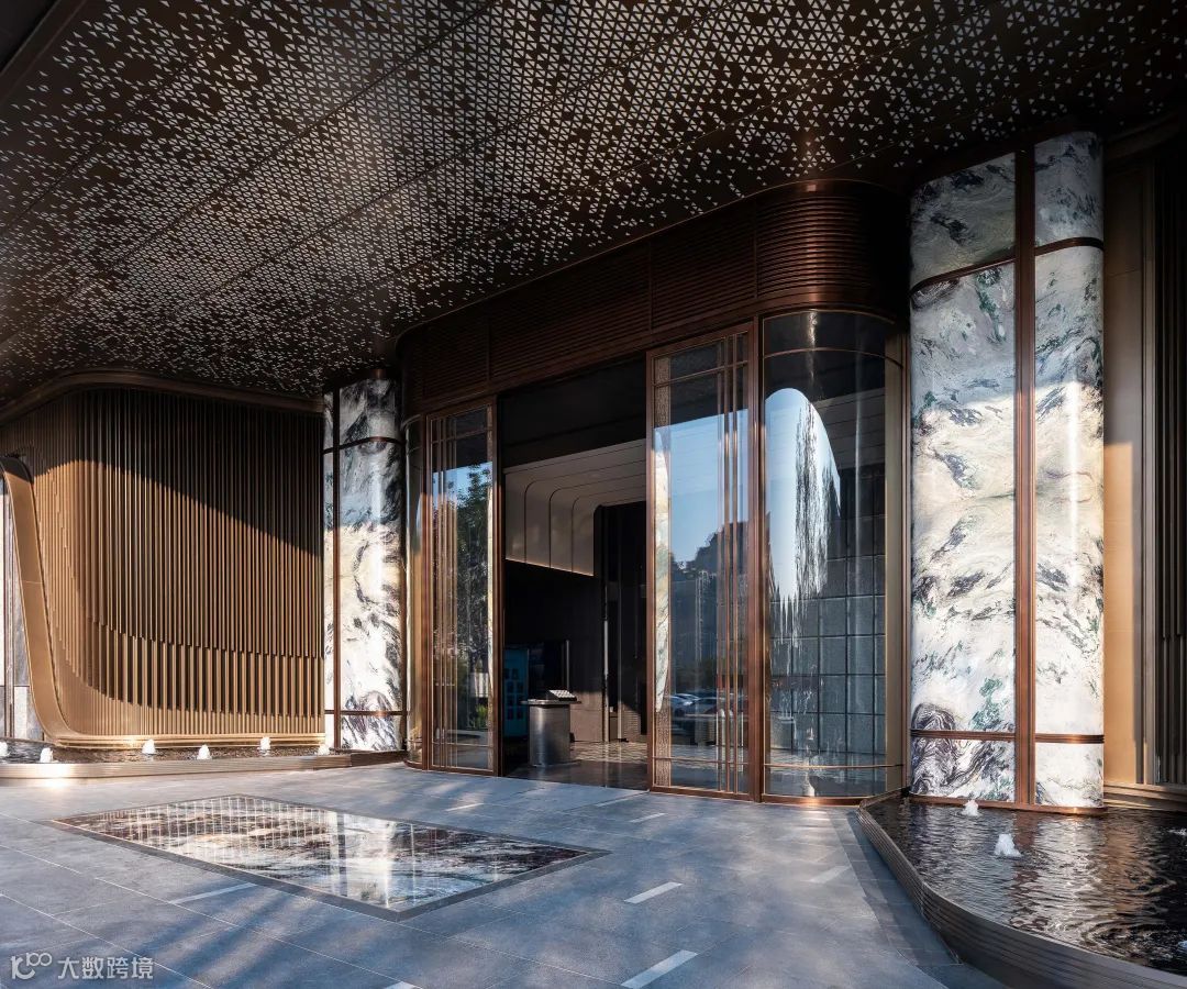 酒店式环岛入户,迎宾水景映照鎏金LOGO,与“云河印”相呼应形成第一道视觉重点。