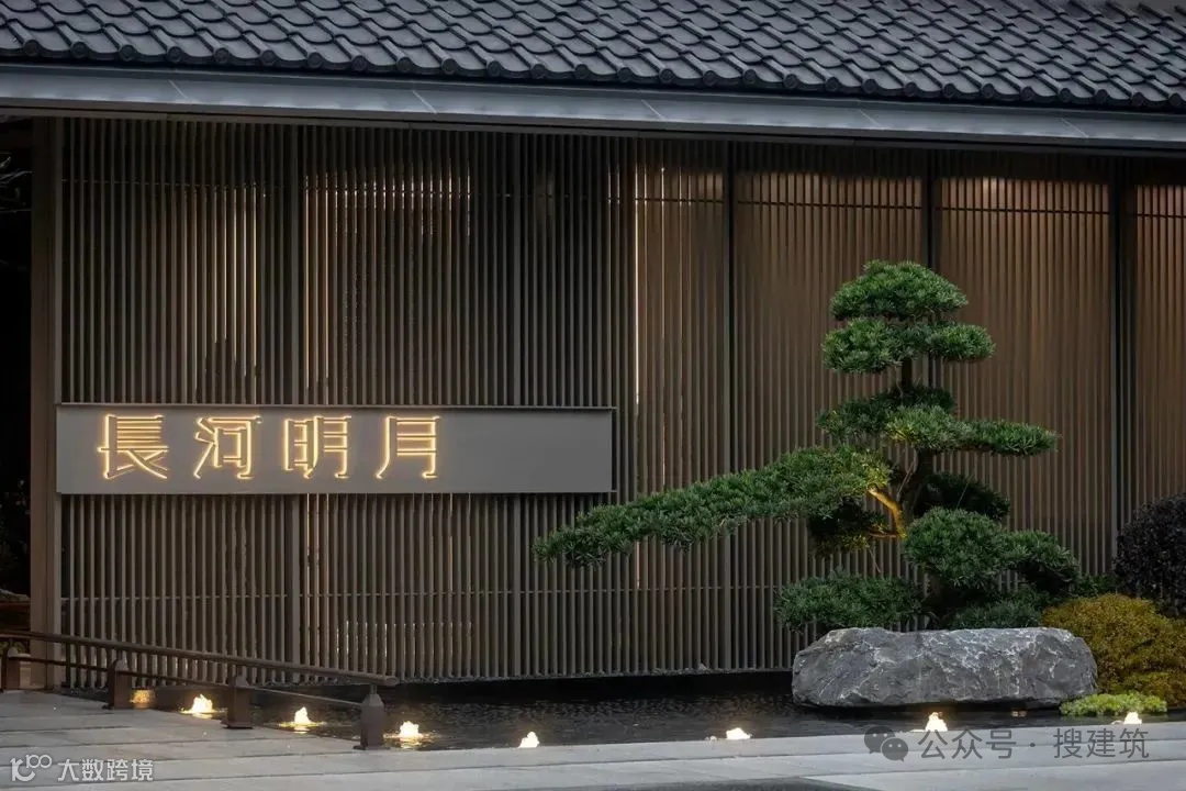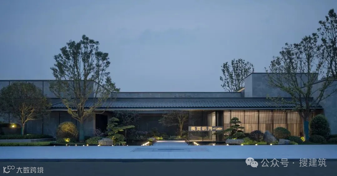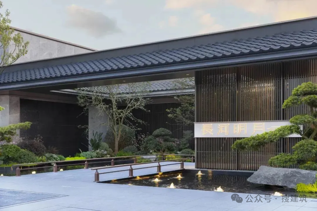 重庆龙湖·长河明月示范区以新派唐代手法造园,再塑盛唐官式府苑。入园大门屋顶,借鉴了唐风屋顶坡度的舒缓自由,但趋于平直,更显出连绵的张力。