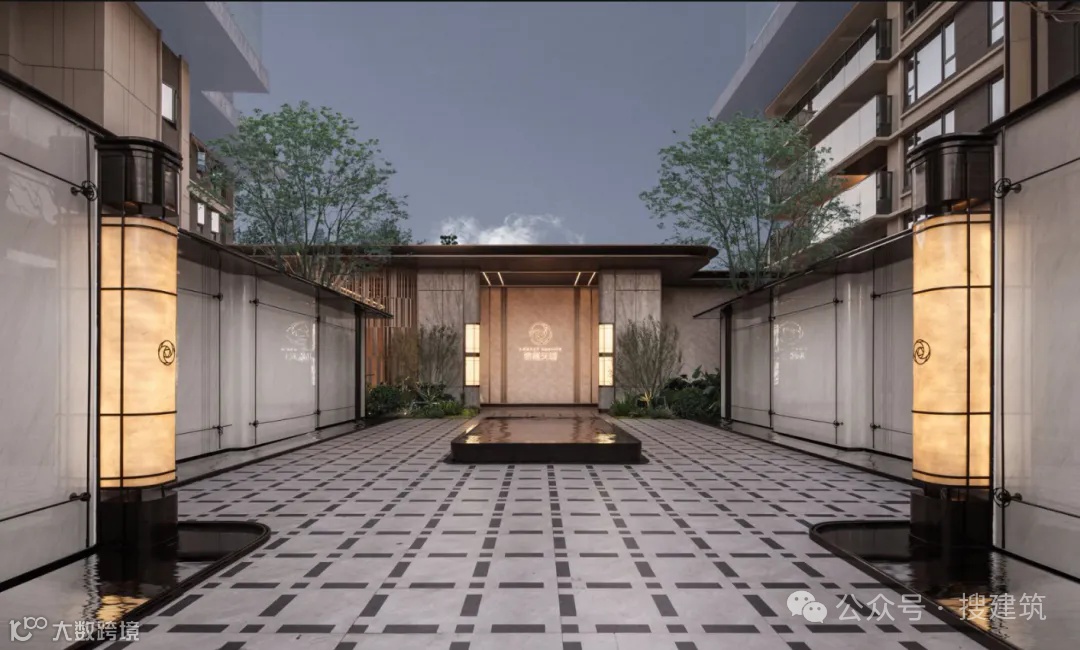 强调归家动线的仪式感。立面造型上通过增加扇屏的方式强调序列干感,虚实对比的手法不仅增加建筑的立体感,还使人能够在行走中探索和发现不同的场景和视角,以此获得最佳的礼序感。
