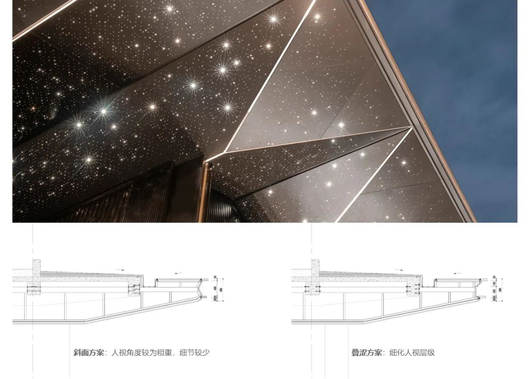 金属棚顶镶嵌了1654颗流光灯,寓意“繁星照归途”,星曜奢华大门,抬头繁星点点,令人浮想联翩。