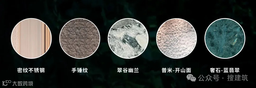 此外,定制山茶花景墙、范思哲黑奢石、蓝钻花岗岩、黑金沙银河之星等名贵石材的出挑设计与应用,不仅是成本指数增长,工艺更是极难打磨。