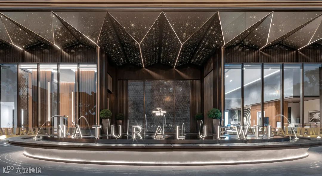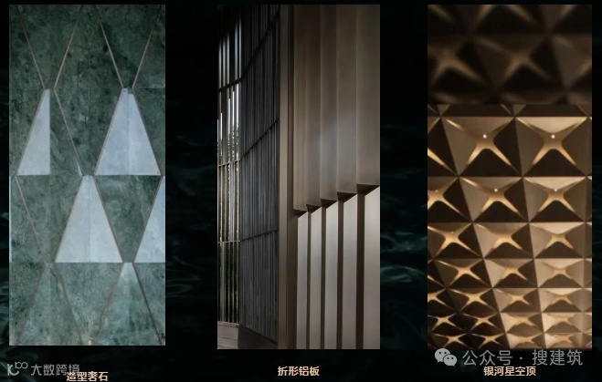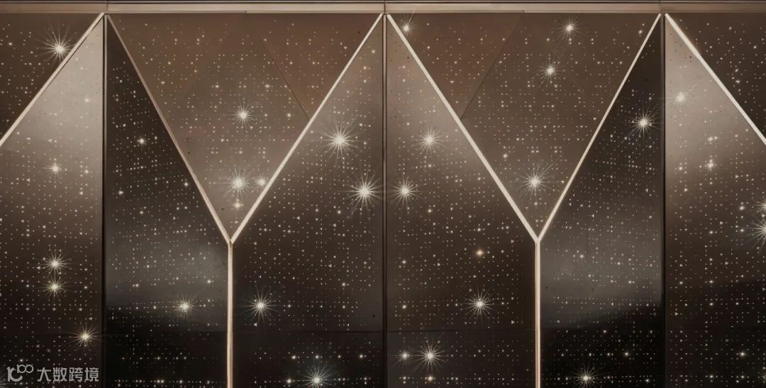 立面设计灵感来源于古代“海丝” 文化,以奢侈品游艇为设计主题,打造海上游艇这一设计理念。1200根香槟金幕帘交织,长短渐变,用数字化的线性美学唤起对海上翻涌的波浪的联想,奢华星空顶意喻繁星点点,华灯初上,一派海上升明月的画面。