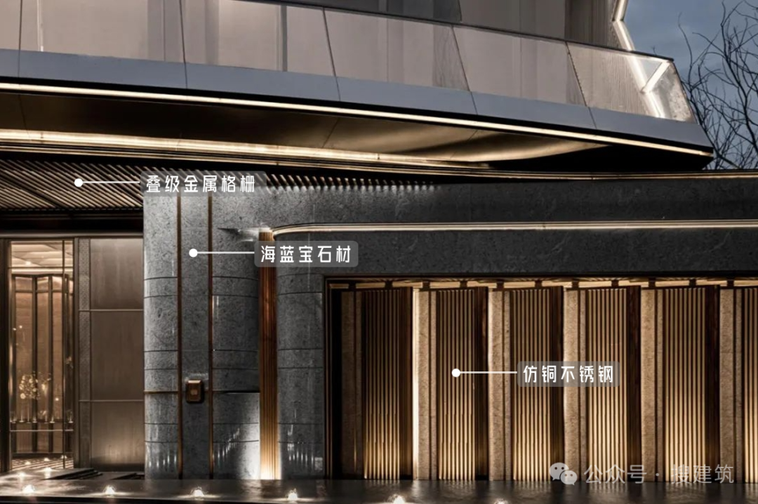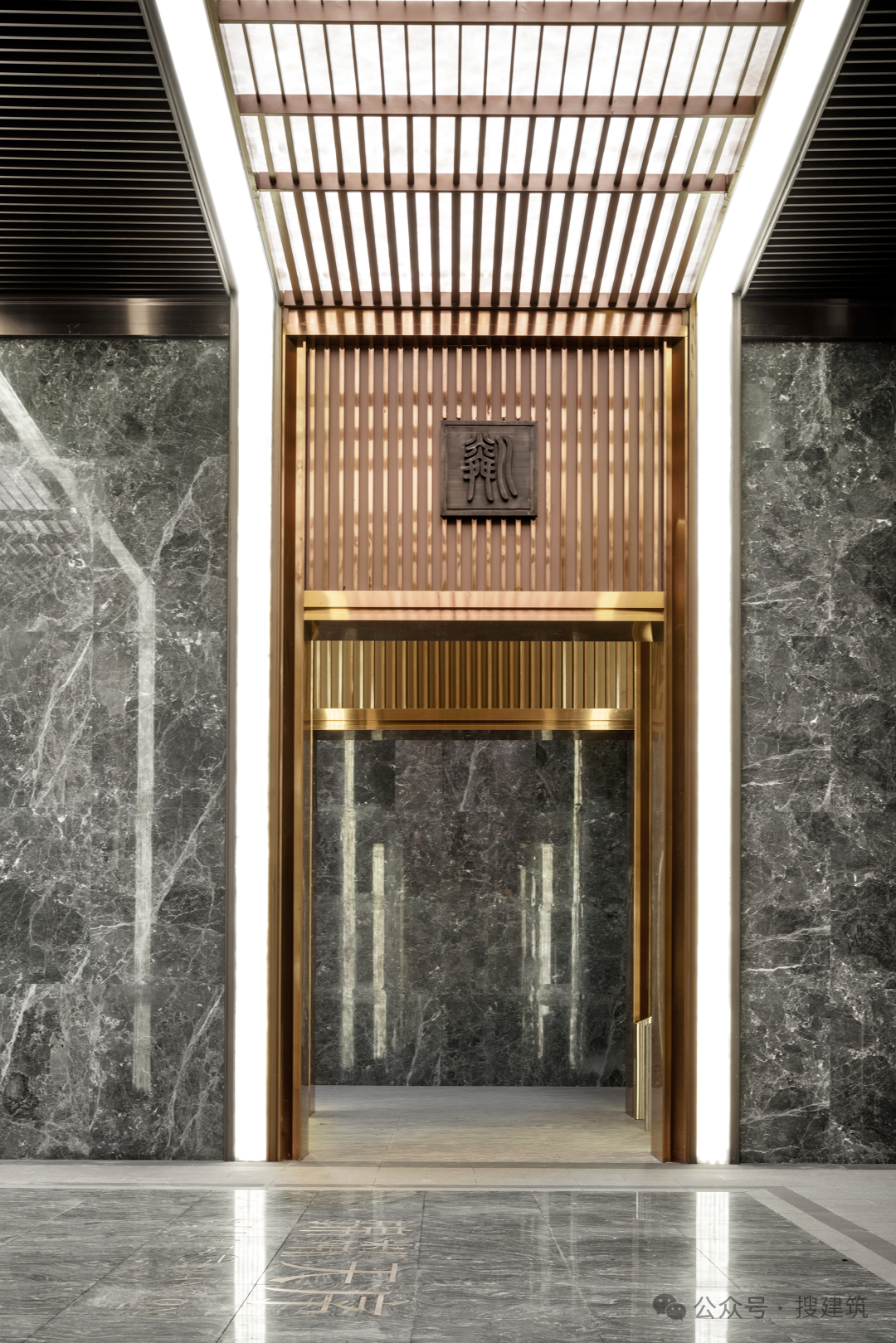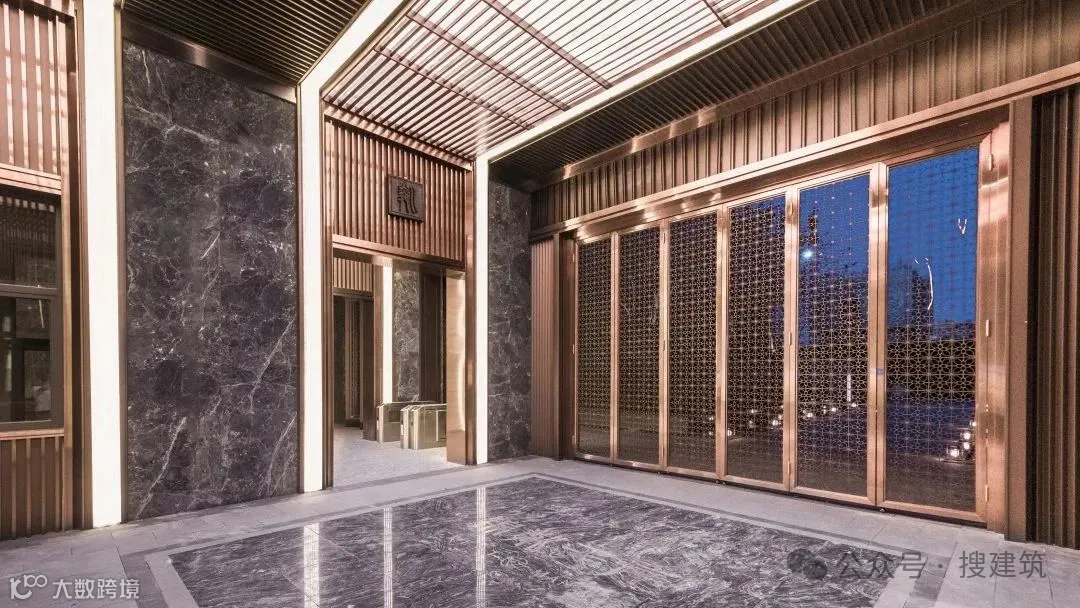 壁柱金属印、吊顶金属格栅、电动门手敲铜及石材镶嵌等一系列工艺工法,让整个入口空间精致耐看。