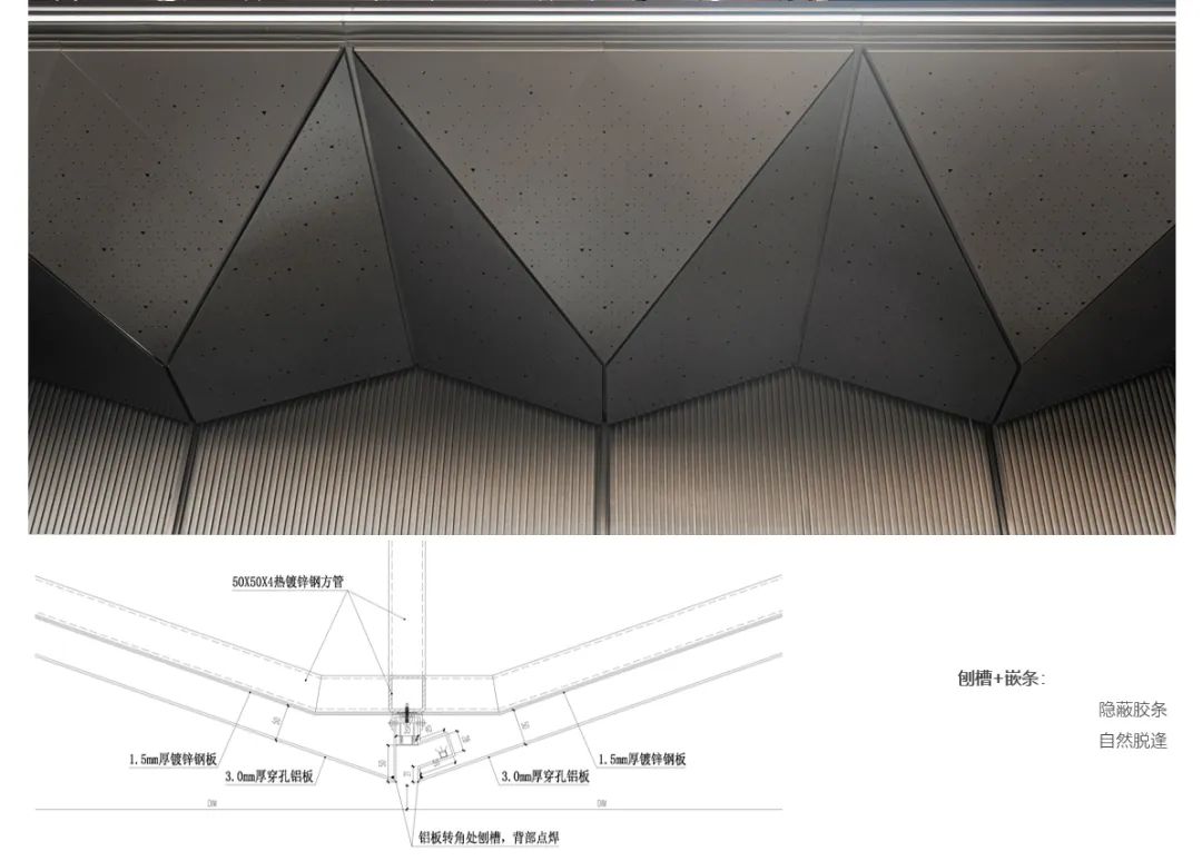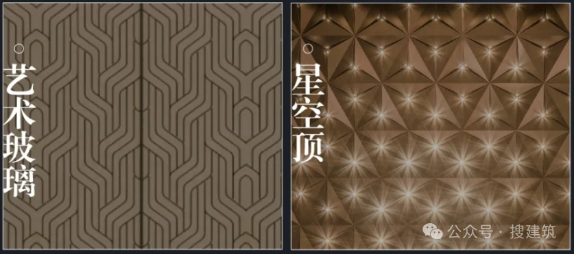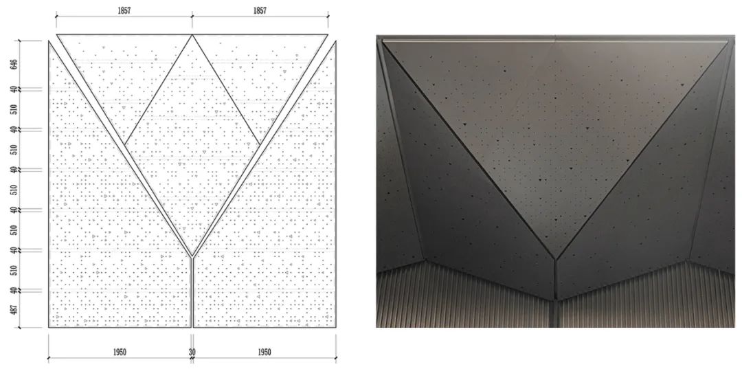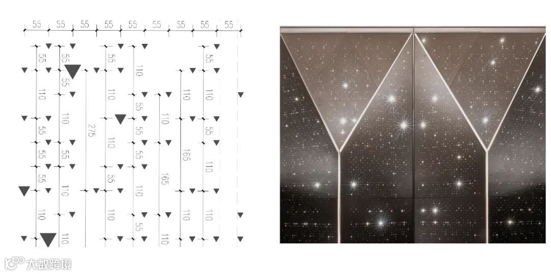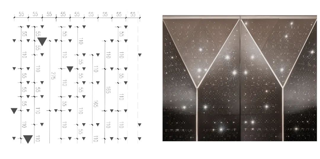 顶板孔洞自由散布,通过分组变化,营造自然而多变的肌理。细控背筋对穿孔效果的影响,以保证呈现更加真实的“星空”。