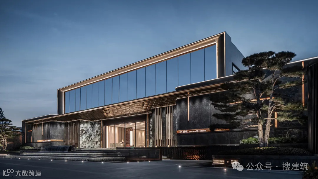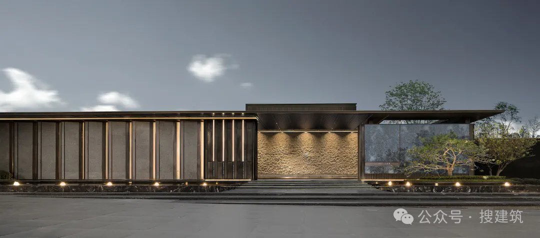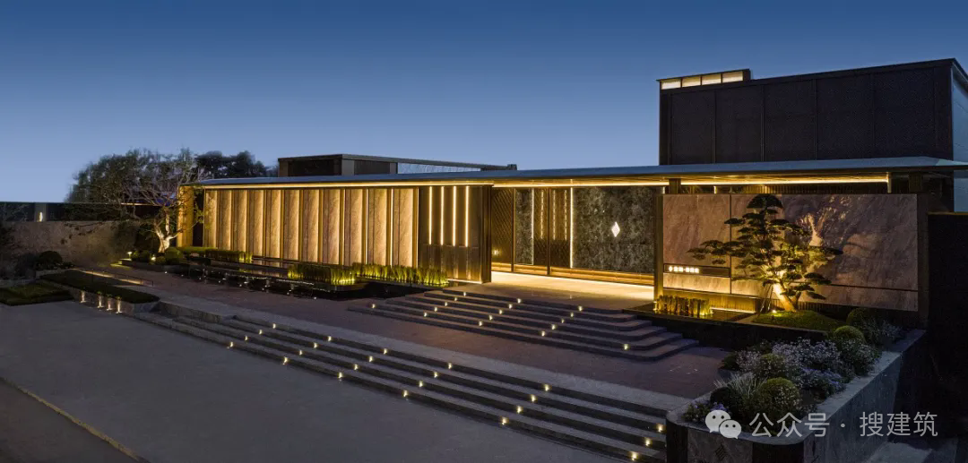 全石材台阶+层级有序的跌水景观,屋顶庄严的金属折板飞檐又在气势上营造了登门入府的仪式感。