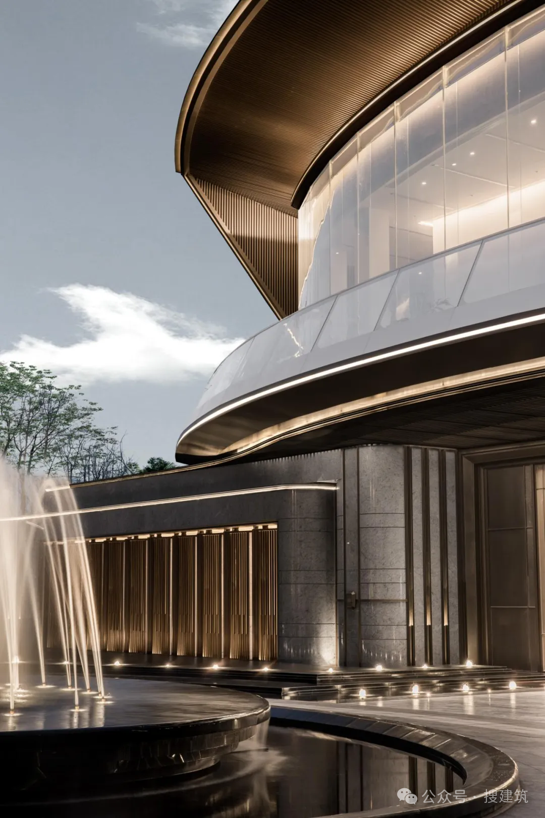 游艇式会所/大门相当吸睛,一个约10米高、未来感、圆弧造型张扬又耀眼的形象面,建筑采用对称的形体构图,一层通过舒展的景墙沿公园界面展开,二层盒子飘浮其上,构建出富有张力和气势的社区形象。