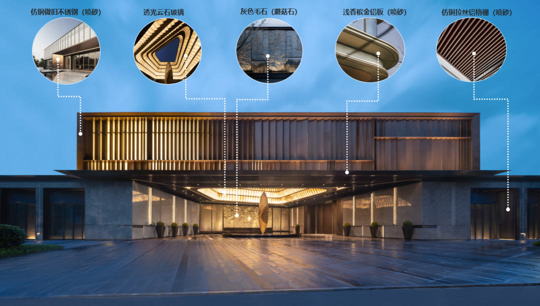 灰色石材、古铜色铝板及金属线条的使用,使得在一层近人尺度上营造出酒店般奢华尊贵感受;二层弧面玻璃、浅色铝板又形成轻盈时尚的气质。