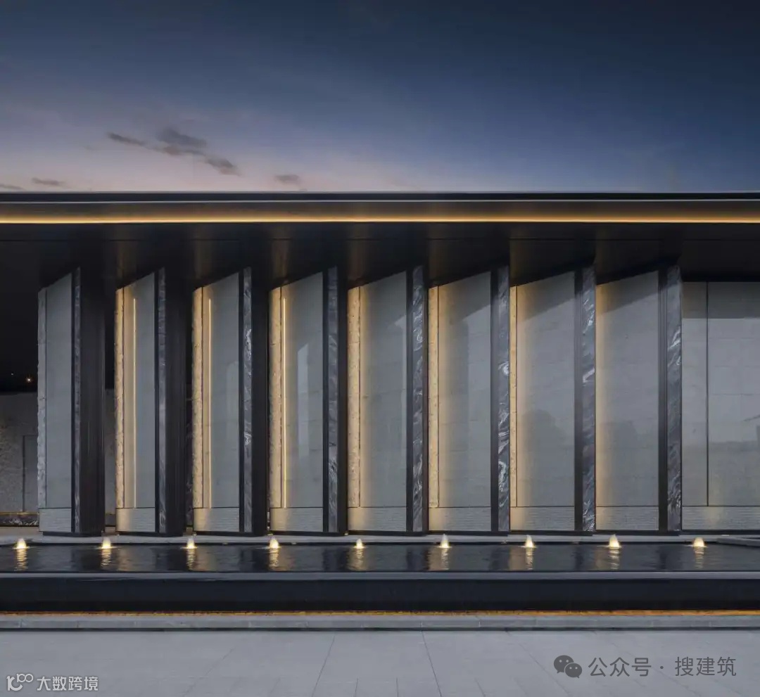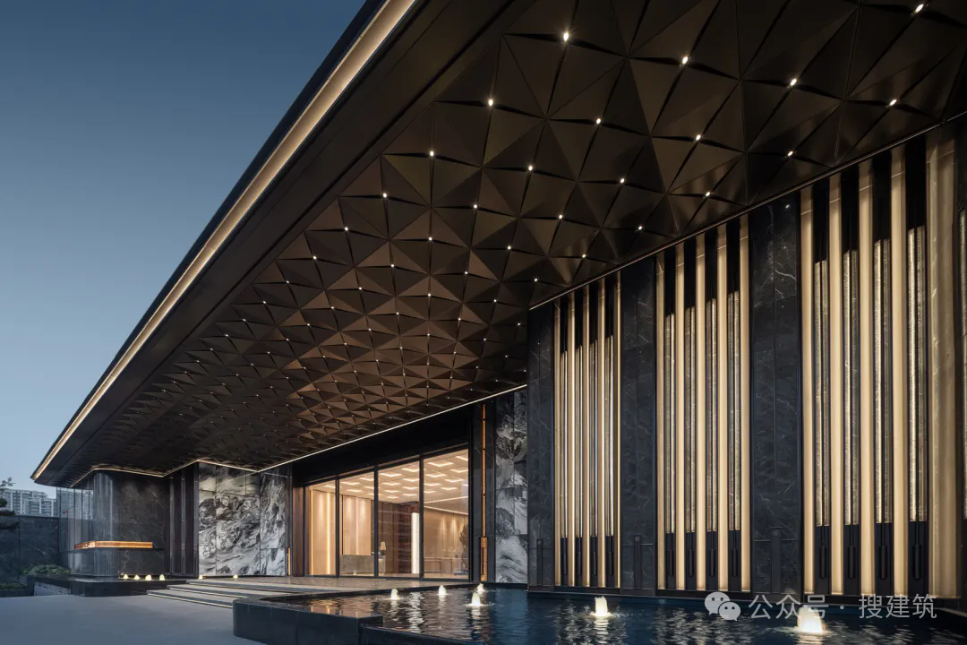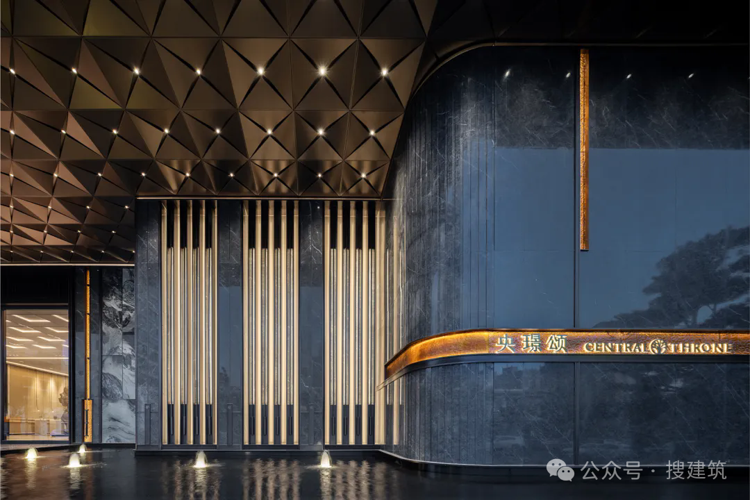 顶部穹顶以云石玻璃打造,淬炼流光艺术;底部以黑沙石构筑水境。酒店式接待前厅,呈现低奢、隐贵的气质格调。大尺度层高、简约的几何体块以及对称性设计。竖向金属格栅由大堂背景延伸至天花,巧妙削弱体块笨重感,同时丰富空间表情。