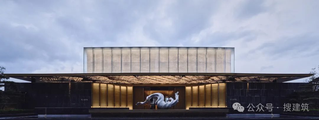 主入口高度尺度惊人,达到约13.5米。顶部冠盖一个极为精致的云端光盒。近三万块极小的银白穿孔铝板,虚实穿编成网,玻璃匣子陈列它们的锋芒,和挑檐的香槟色穿孔铝板相连,形成云奔河涌的光影,在空中漫卷,落地激起浪,又凝成「云水相颂」的生动雕塑。