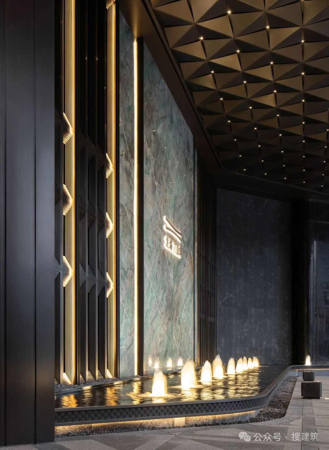 从宝格丽酒店汲取灵感,打造的酒店式落客区:手工打磨的华丽喷泉,两侧近50米归家仪式景墙,不锈钢奢华悬浮星空顶,几百个单元模块内镶嵌定制灯光,如坠星河。