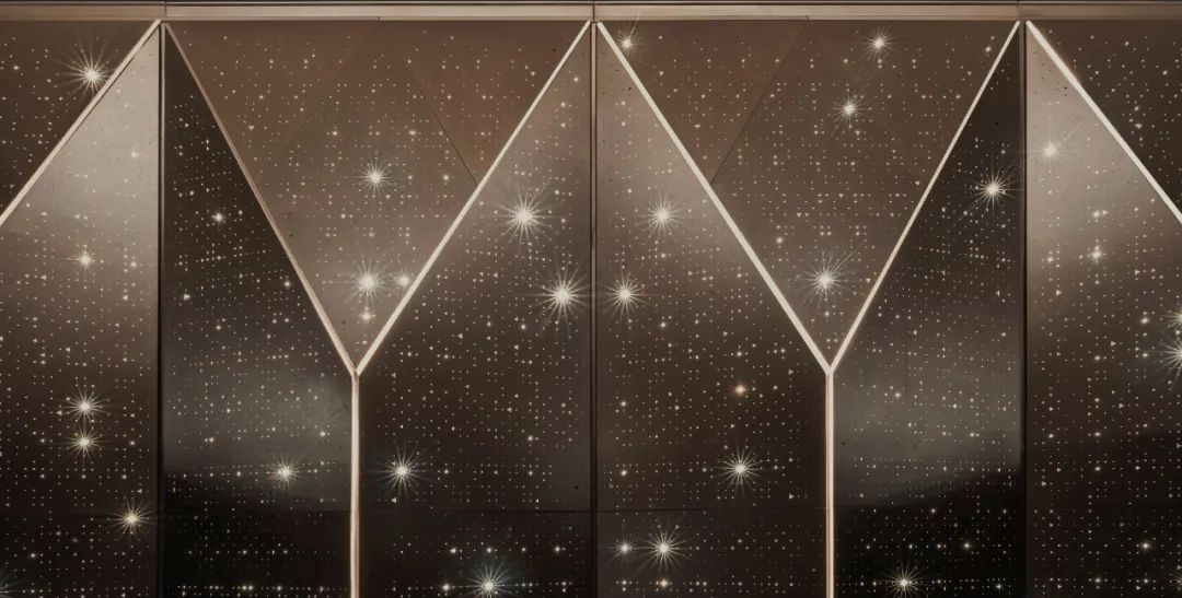 入口大门长49M、高7M,色调以深色花岗岩为主色调,细腻的拉槽面与灰金色不锈钢结合,沉稳精奢,低调中尽显雅致。50米的沿街面气势恢宏,无比尊贵。菱形的星空幕墙,将夜晚的灯光转化为无数流动的星辰。