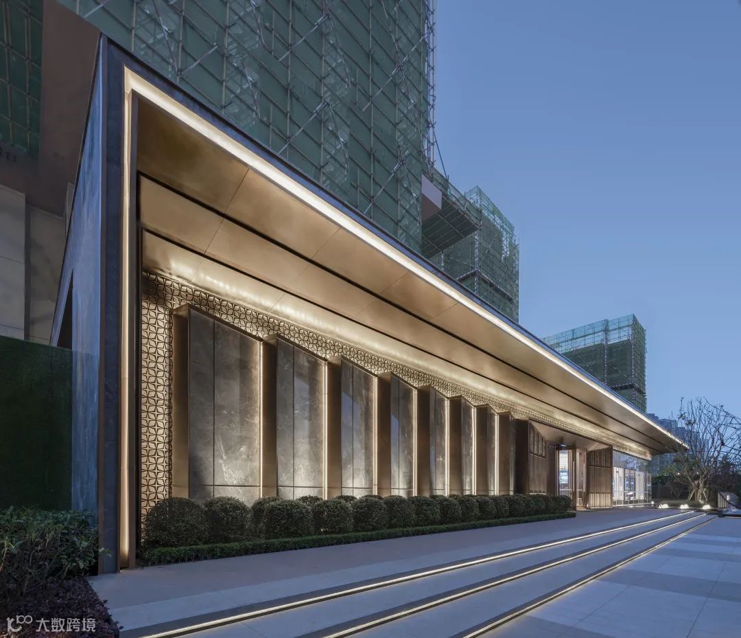 在细节打造上更是精益求精,引入精致的鎏金云纹、金属格栅等古代皇家建筑元素,搭配24根云石透光线条、3000K暖白光、伯爵灰大理景墙,与入园大堂形成158°倾角,整体蕴含着聚客汇财、天圆地方等寓意。