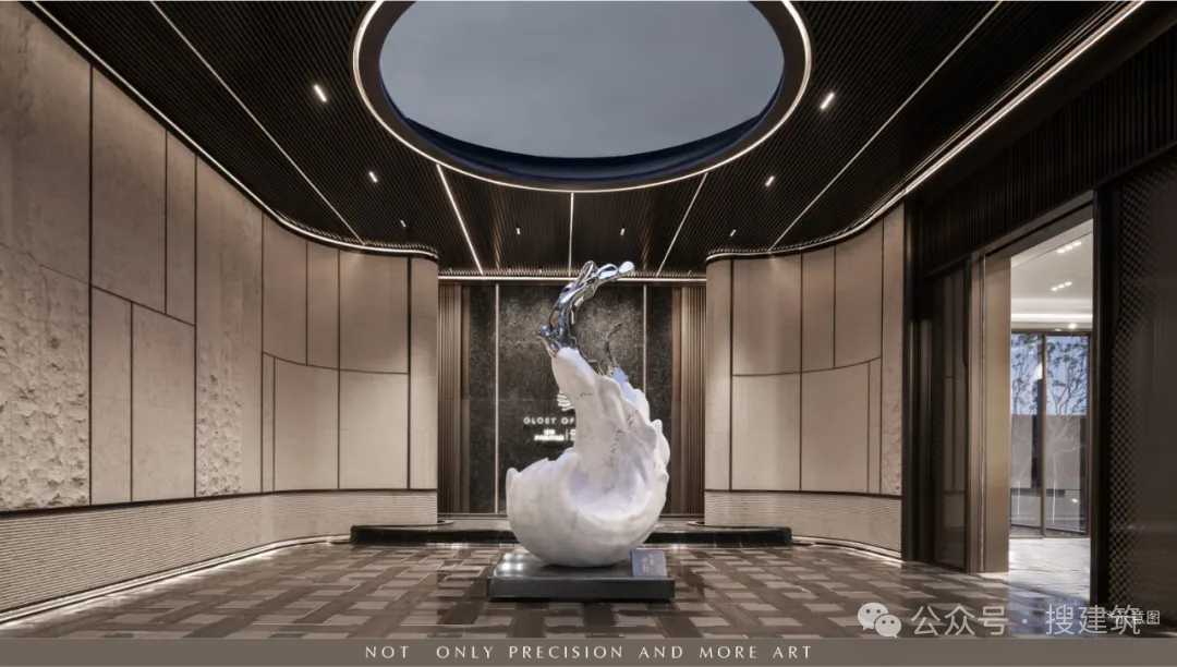入口重量级的艺术作品“云卷云舒”由雕塑艺术家方旭定制。汉白玉温润雅致,不惜以整石雕塑融合反光金属材质,冷峻与温润的对比,将云与河的柔美曲线定格在圆形天井之下。