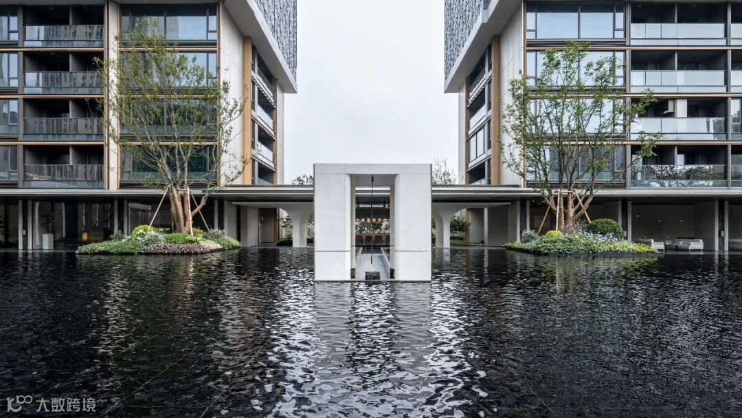 于城市中,坐山引水,以现代美学手法融合中式传统神韵,延续义乌山水胜景,堆山理水,筑造雅致水院。悬崖飞瀑,置石堆叠,清潭弥雾,莲叶吐苞,于闹市中构建立体山水画卷,勾勒当代东方雅韵。