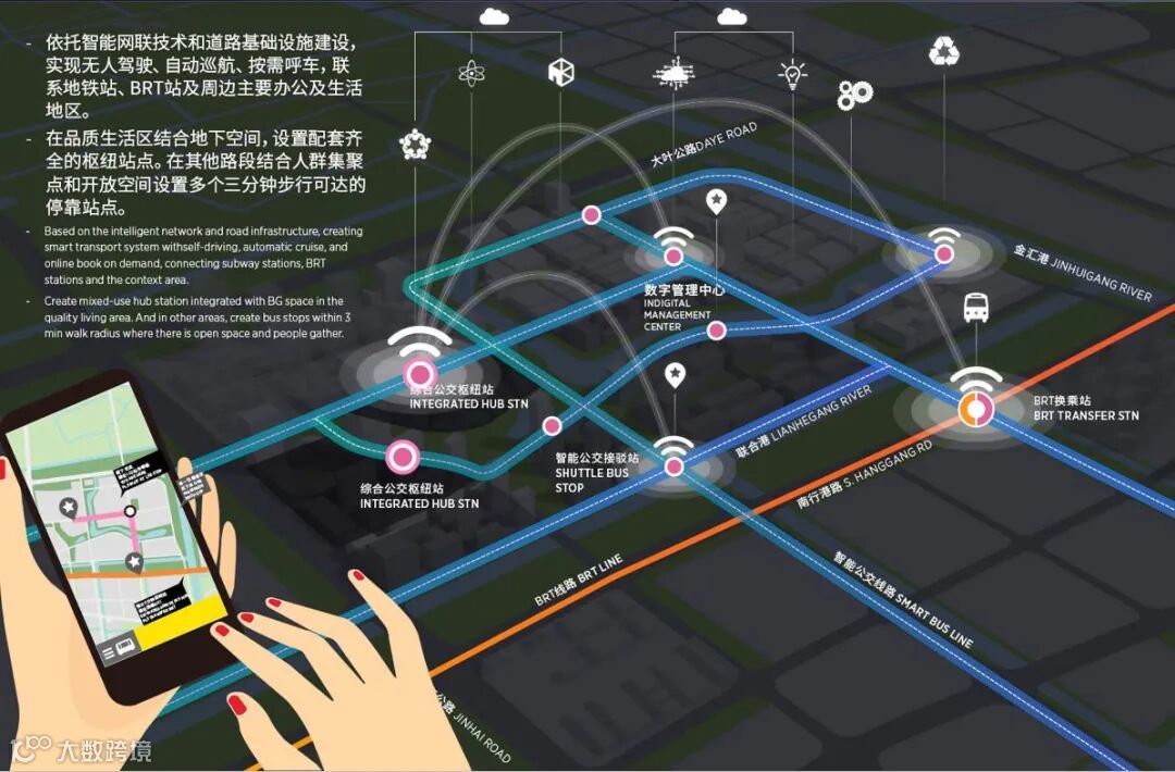作为智能网联汽车综合测试示范区,未来园区的使用者可通过智能网联公交系统,按需呼叫无人驾驶,自动巡航的公共交通工具,联系地铁站、BRT站或周边主要的办公及生活目的地。