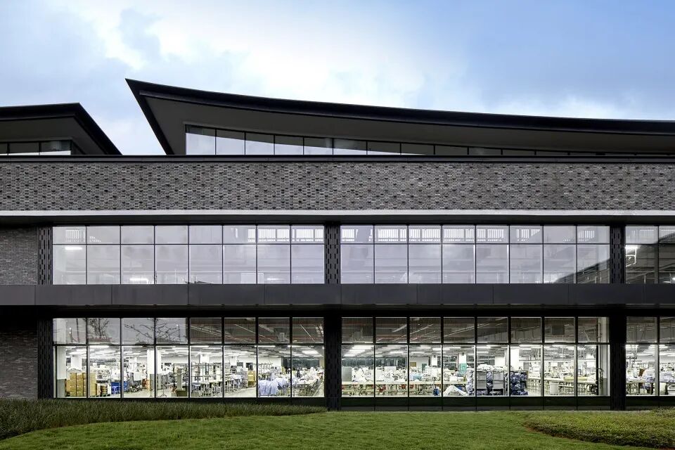 除青砖墙体之外,建筑师又加上了一层渐变的半通透“竹帘”。尤如一道窗纱使得砖墙结构若隐若现,既与遍布四周的花草树木轻易融合,又柔化了横向展开的庞大建筑体量,使工厂在自然环境中显得和谐而谦卑。