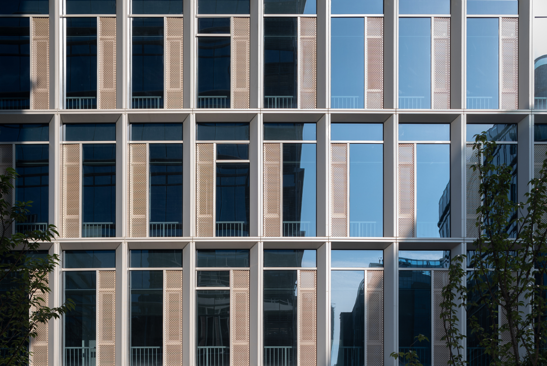 新建的百叶立面通过反射、折射阳光,在建筑立面呈现了波光粼粼的动态视觉体验。同时,百叶立面为室内提供柔和的侧向光源,也满足了数字化办公模式所要求的直射光源控制要求。