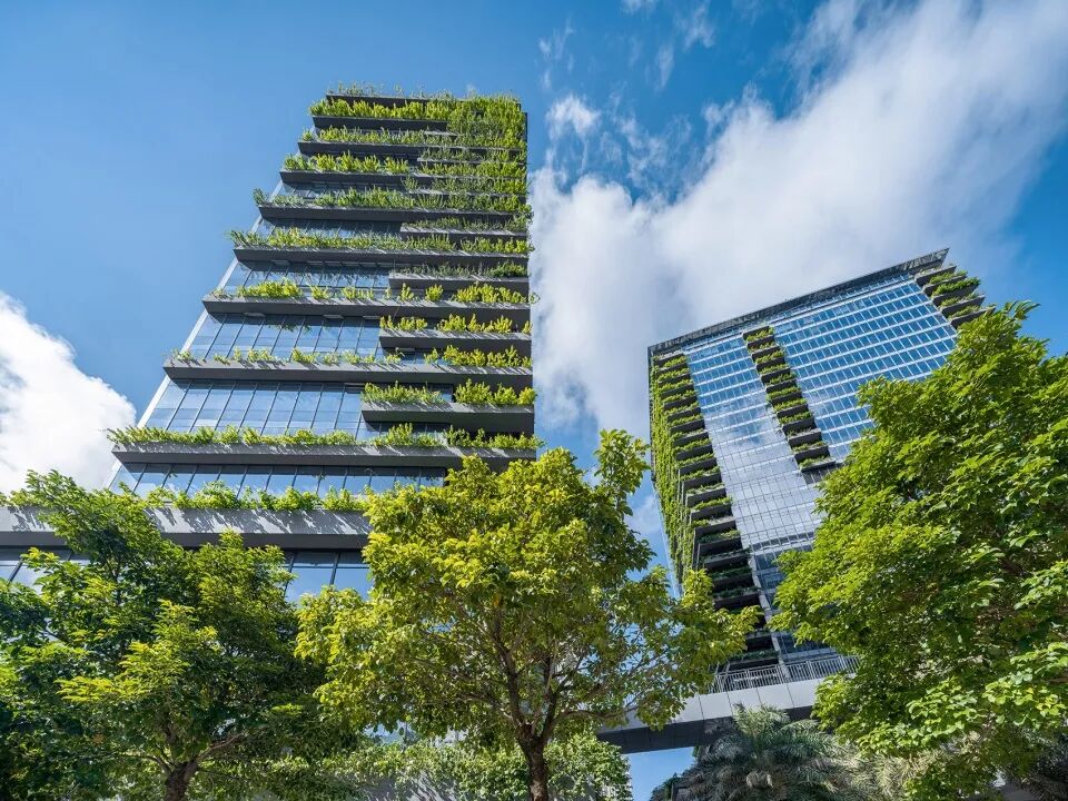 楼层边缘和退台边缘,出挑通长的绿化种植池,栽种勒杜鹃、君子、龙吐珠等易于打理的本土藤本植物,塑造郁郁葱葱的建筑表面。