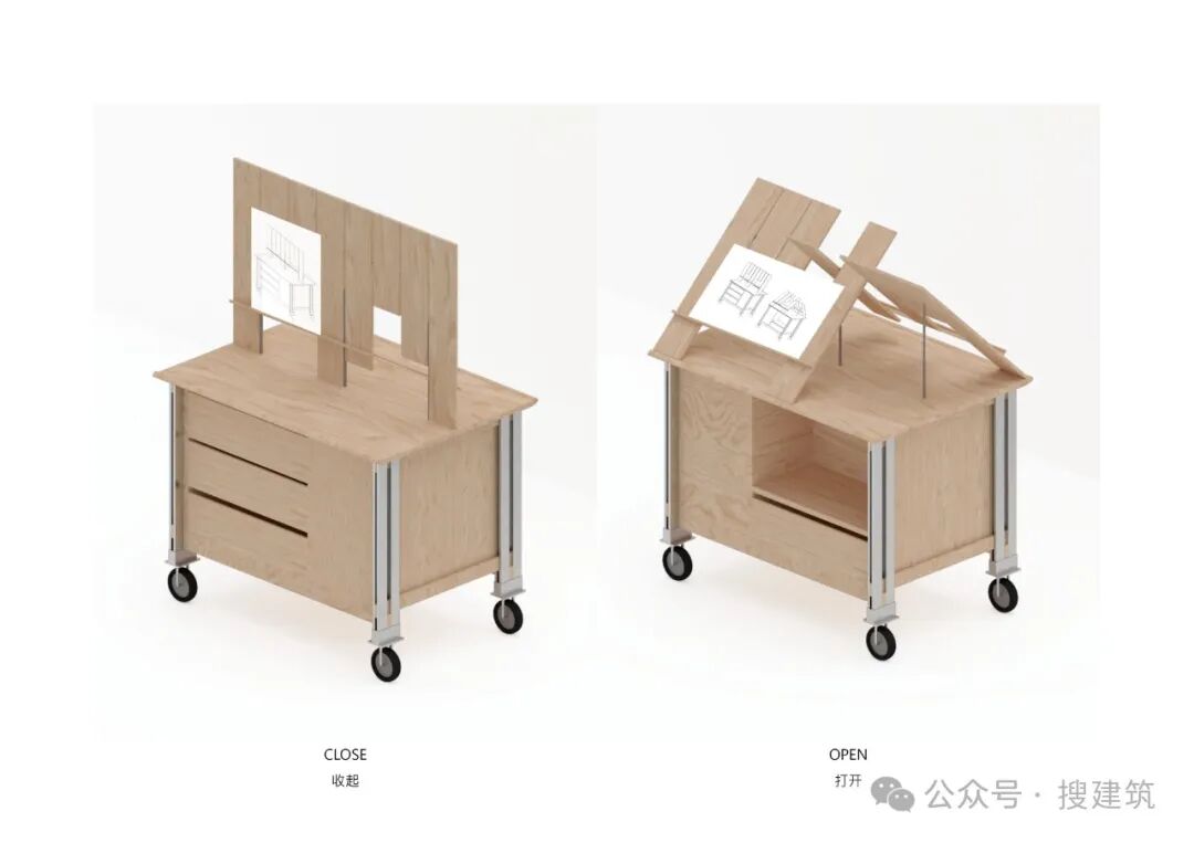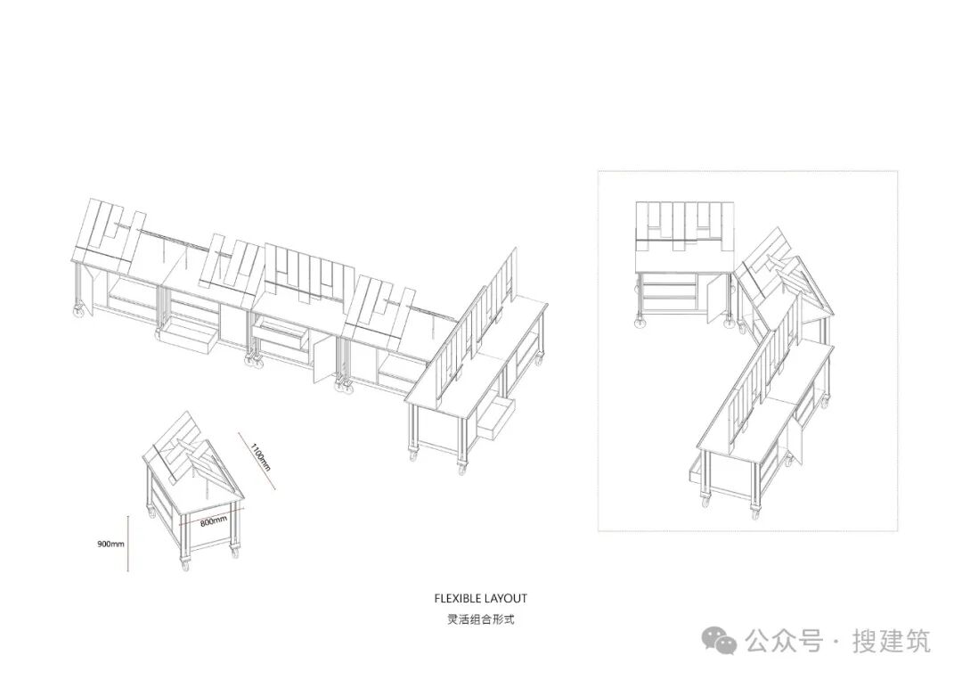 迷你屋顶。将尺度再缩小到室内的家具。展陈中岛的岛台设计,设计团队将外立面的大屋顶缩小至了道具的尺寸,把它变成了可灵活拆装和拼接的陈列架。模块化。在此次的项目中,设计团队利用原本墙面的特征,基于‘实‘与’空‘的韵律,设计了模块化的展柜设计。设计满足了:当下展陈的便利性;日后使用的延展性。