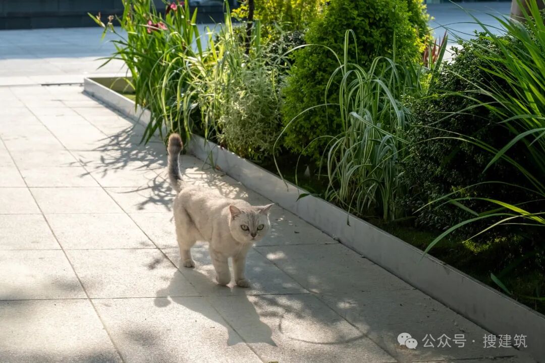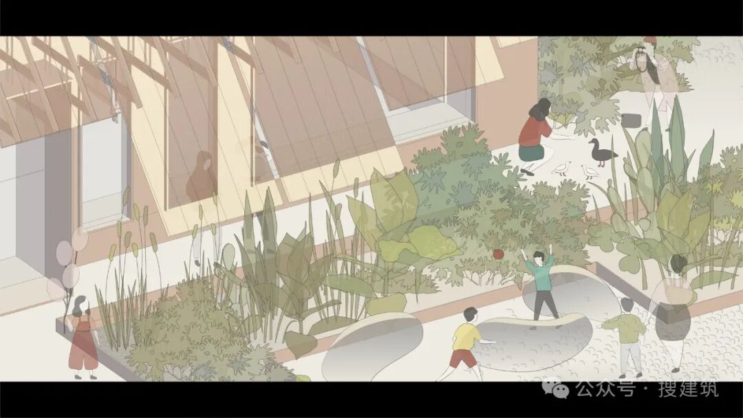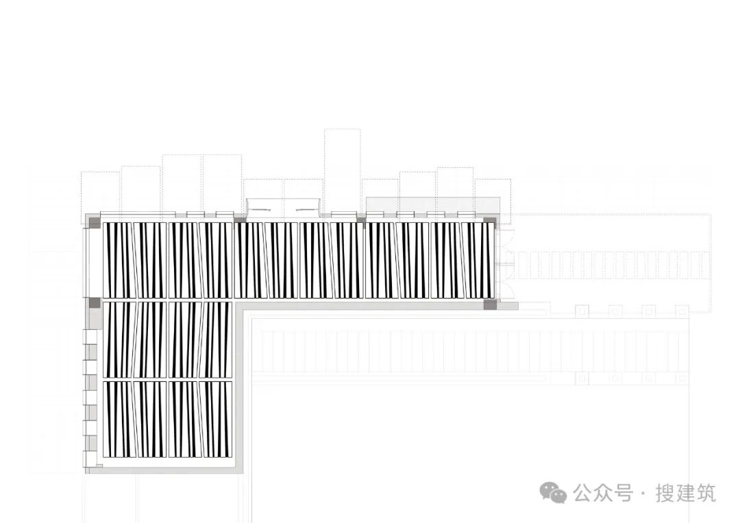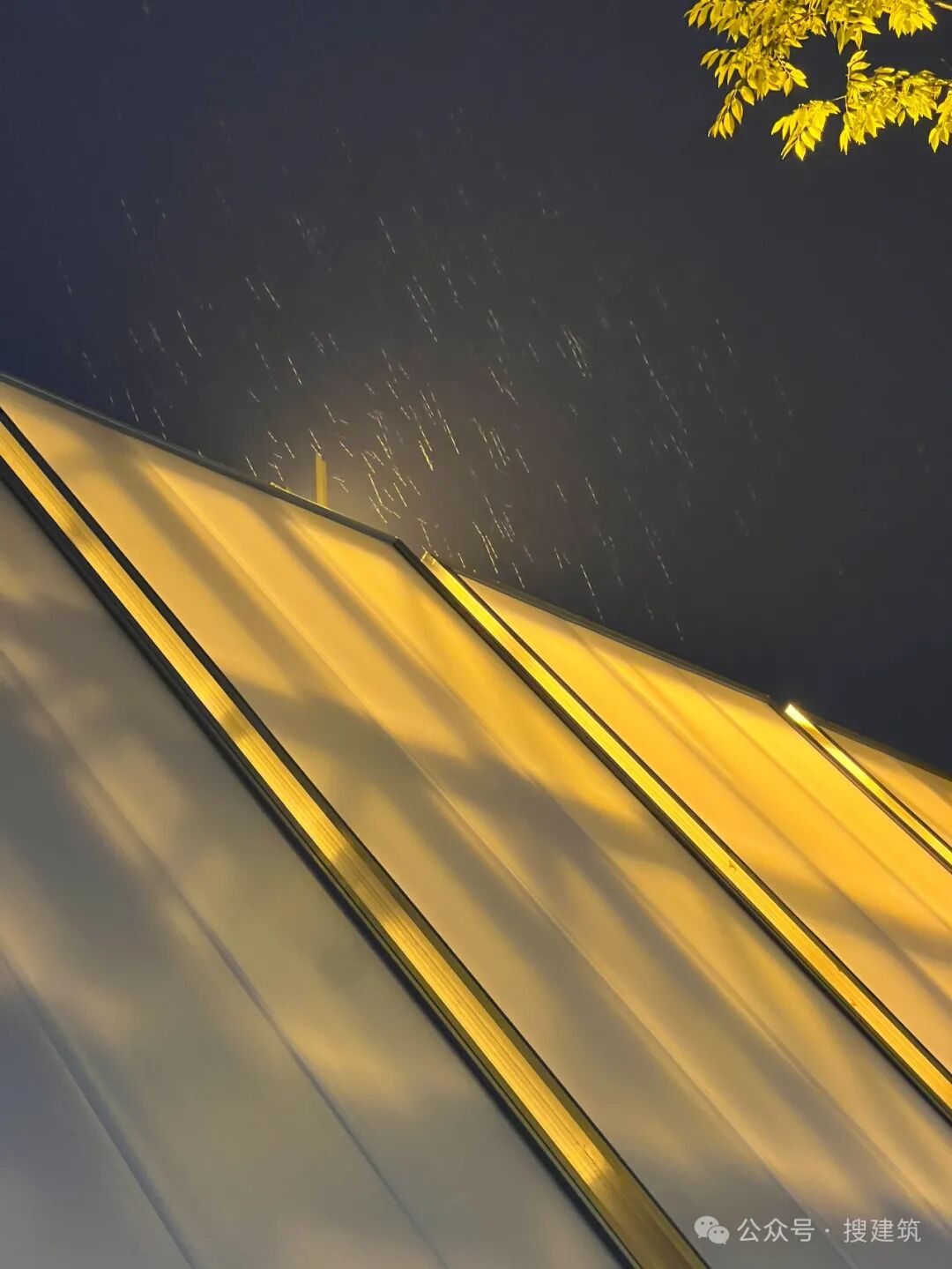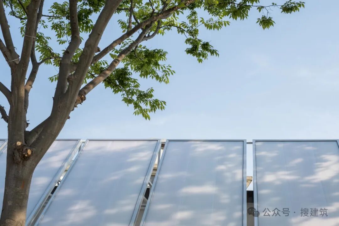 大屋顶。设计团队将整个广场想象成社区客厅的概念:观众服务中心的立面及部分的景观成为城市雕塑,供观众互动体验。拆除原始的墙面后,设计团队架起了 11 个屋顶,或长或短,或高或低,组成了一整个韵律的大屋顶,访客可在屋顶下栖息和休闲。