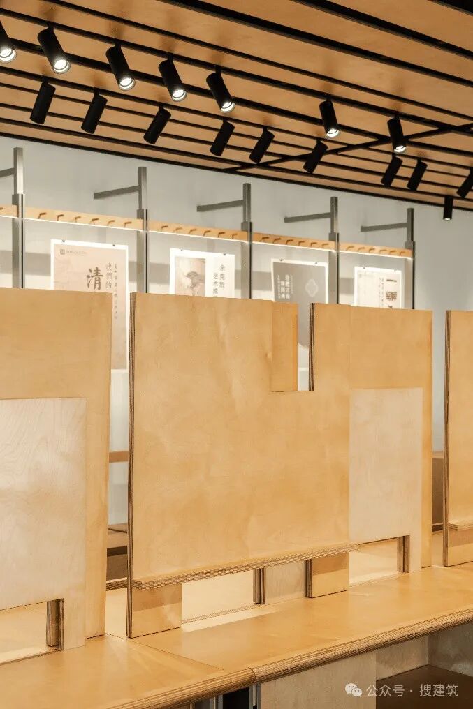Roof (M). Continuing indoors, we transformed the ceiling into a "puzzle game" with trapezoidal modules arranged in five different patterns, forming the "roof" within the space. This modular approach reduces construction difficulty and shortens the project timeline.