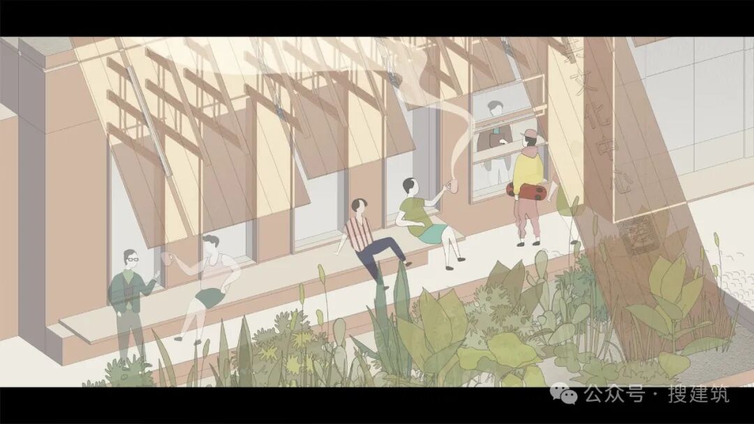 改造策略。将立面打开,统一立面的语言,更好得被观众看到和使用。提炼视觉亮点,同时更符合公共文化中心的调性。材料上用冷和暖的碰撞,营造出亲切同时又前沿艺术的氛围